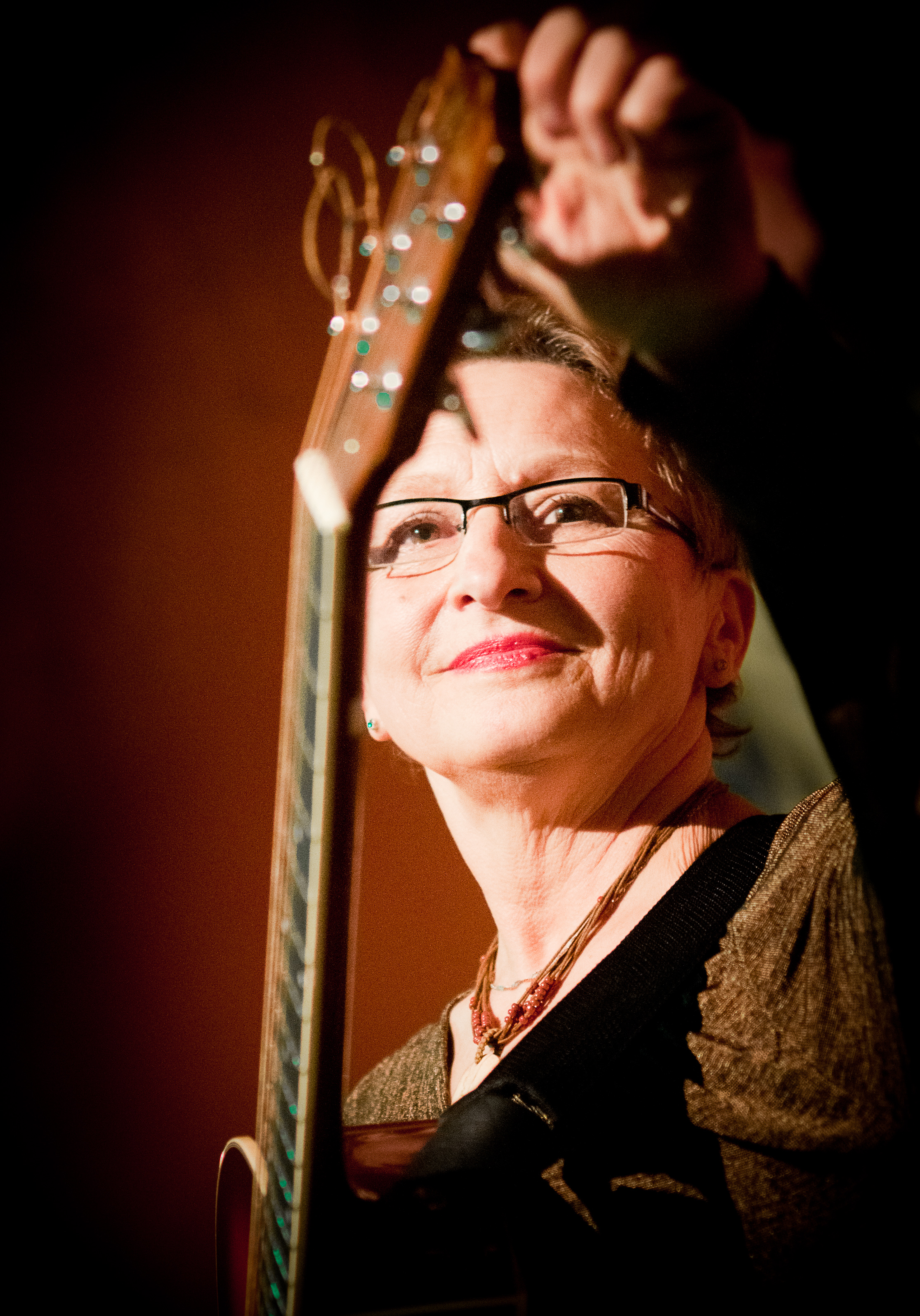 English: Dagmar Andrtová-Voňková tuning Guitar at Evžen, Opava, Czech republic