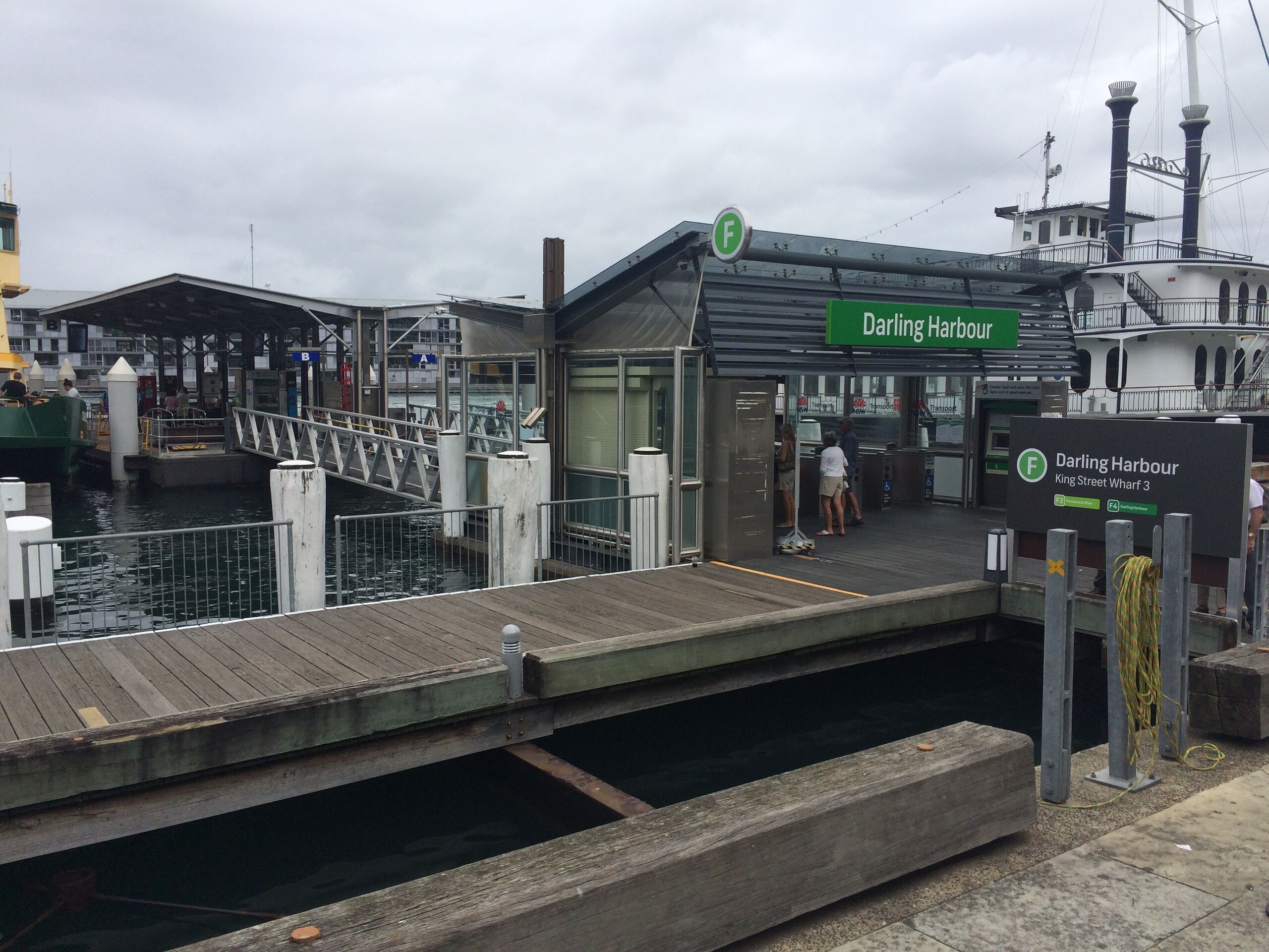 English: An overview of the redeveloped Darling Harbour ferry wharf, a stop on the F3 Parramatta River and F4 Darling Harbour routes of the Sydney Ferries network. Photograph was taken on 22 March 2015. |