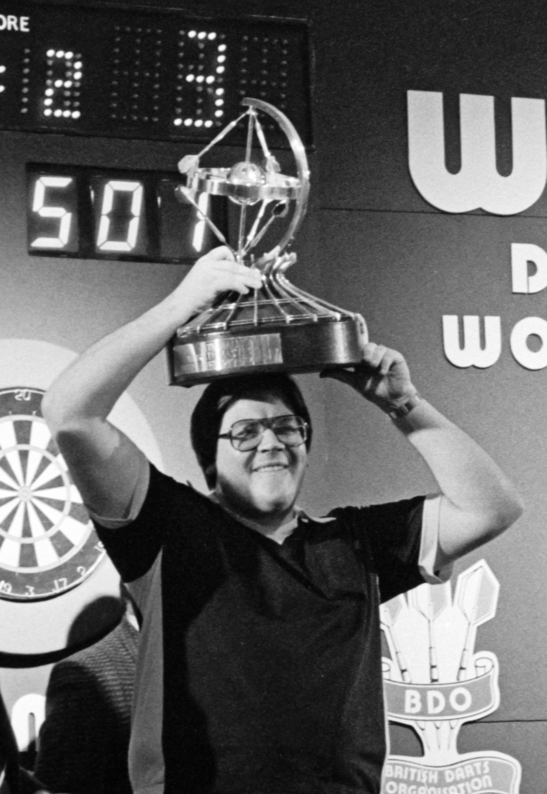 Deutsch: Dave Whitcombe, englischer Dartspieler (*1954), nach seinem Sieg bei den Winmau World Masters 1985 |