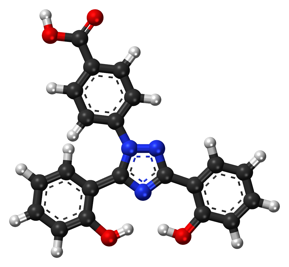 English: Ball-and-stick model of deferasirox (original brand names Exjade and Jadenu)—an orally available iron chelator. Created using Accelrys DS Visualizer 4.1 and Adobe Photoshop CC 2015.