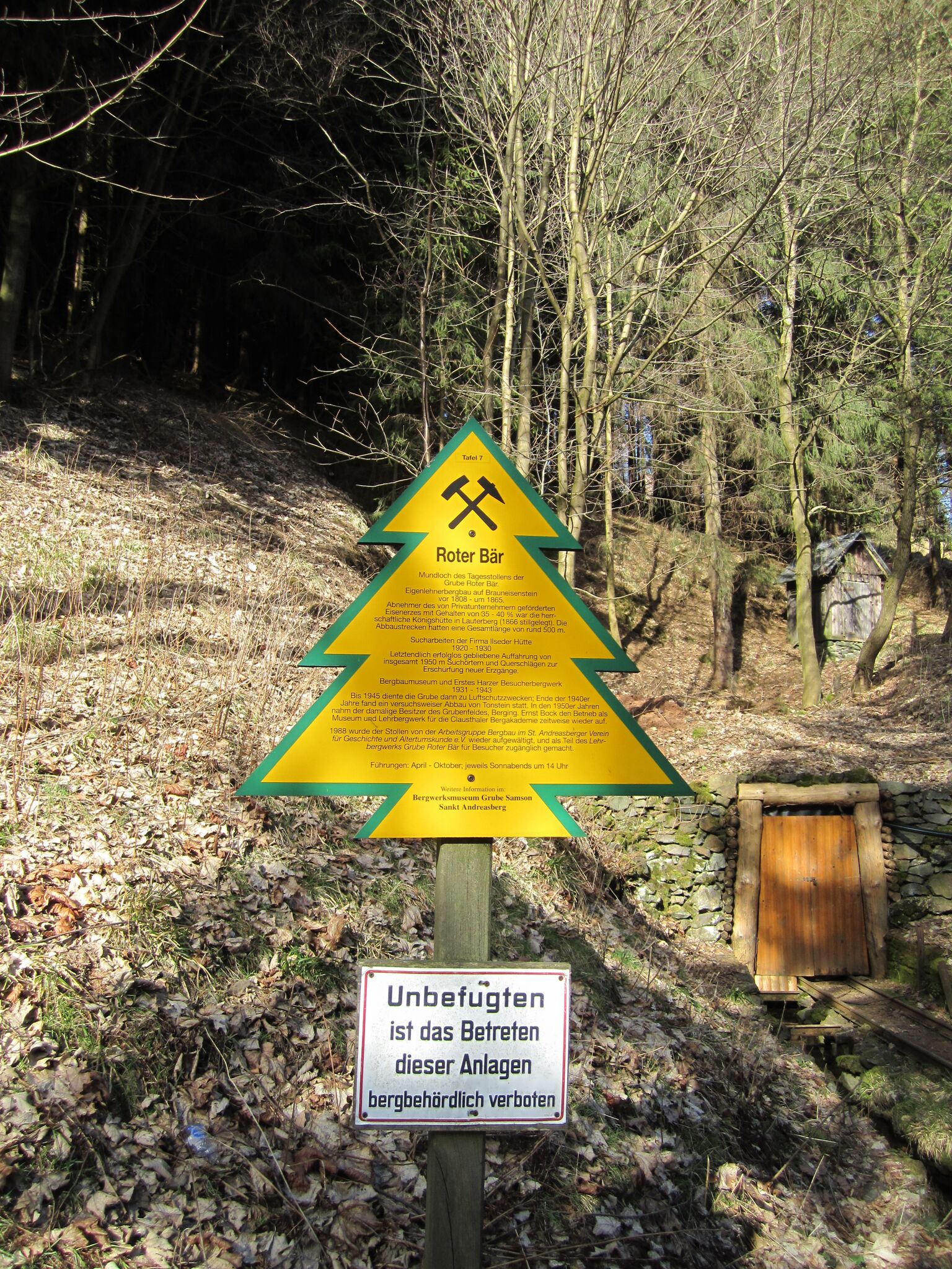 Deutsch: Mundloch mit Dennerttanne der Grube Roter Bär in Sankt Andreasberg, Niedersachsen, Deutschland. |