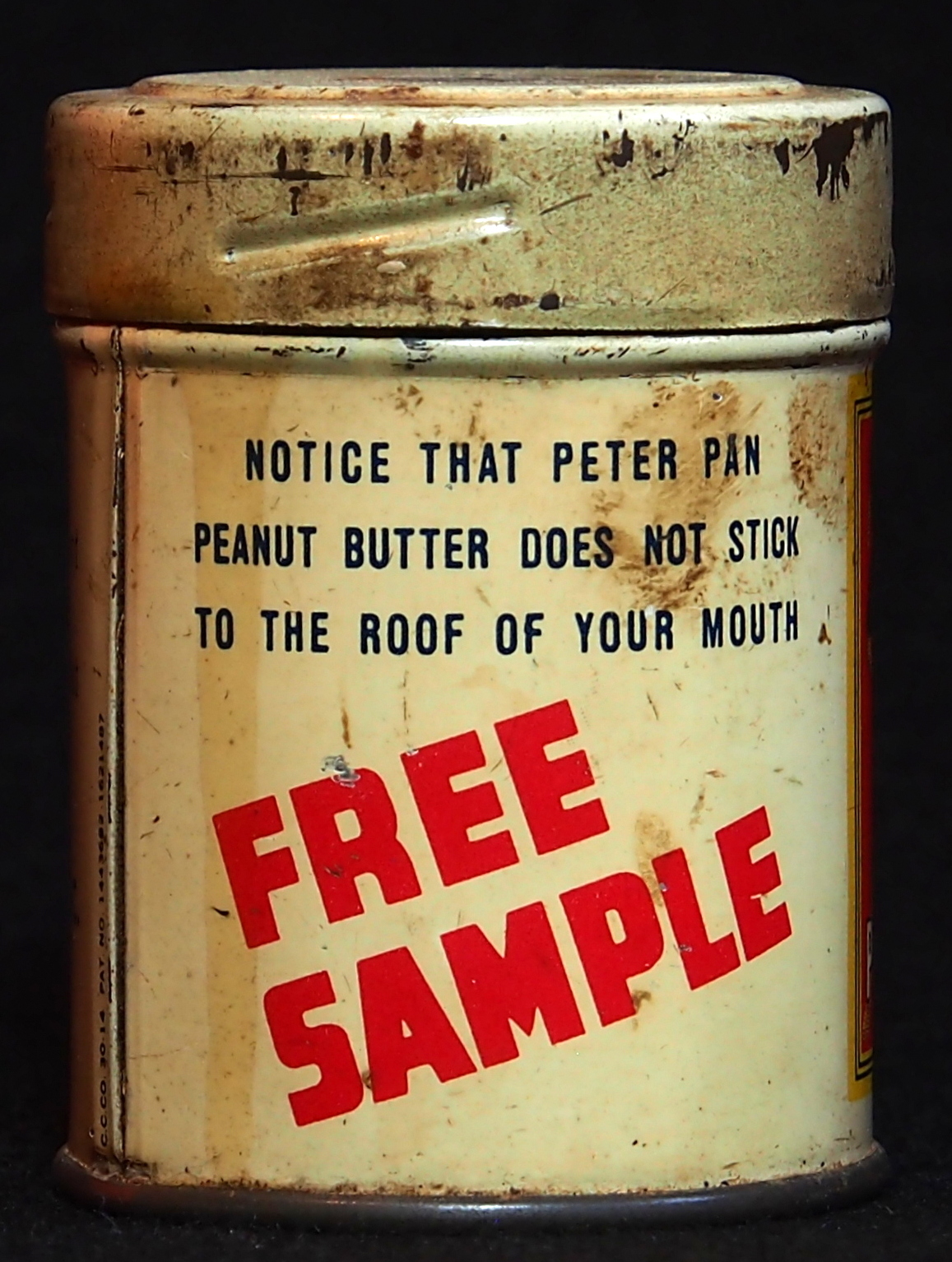 English: Peter Pan peanut butter sample can, boldly labeled "FREE SAMPLE" in red letters and promising "Peter Pan peanut butter does not stick to the roof of your mouth." Photographed at a collector of Droste memorabilia and old tin cans. For more info see tincollectors.nl or email info@tincollectors.nl |