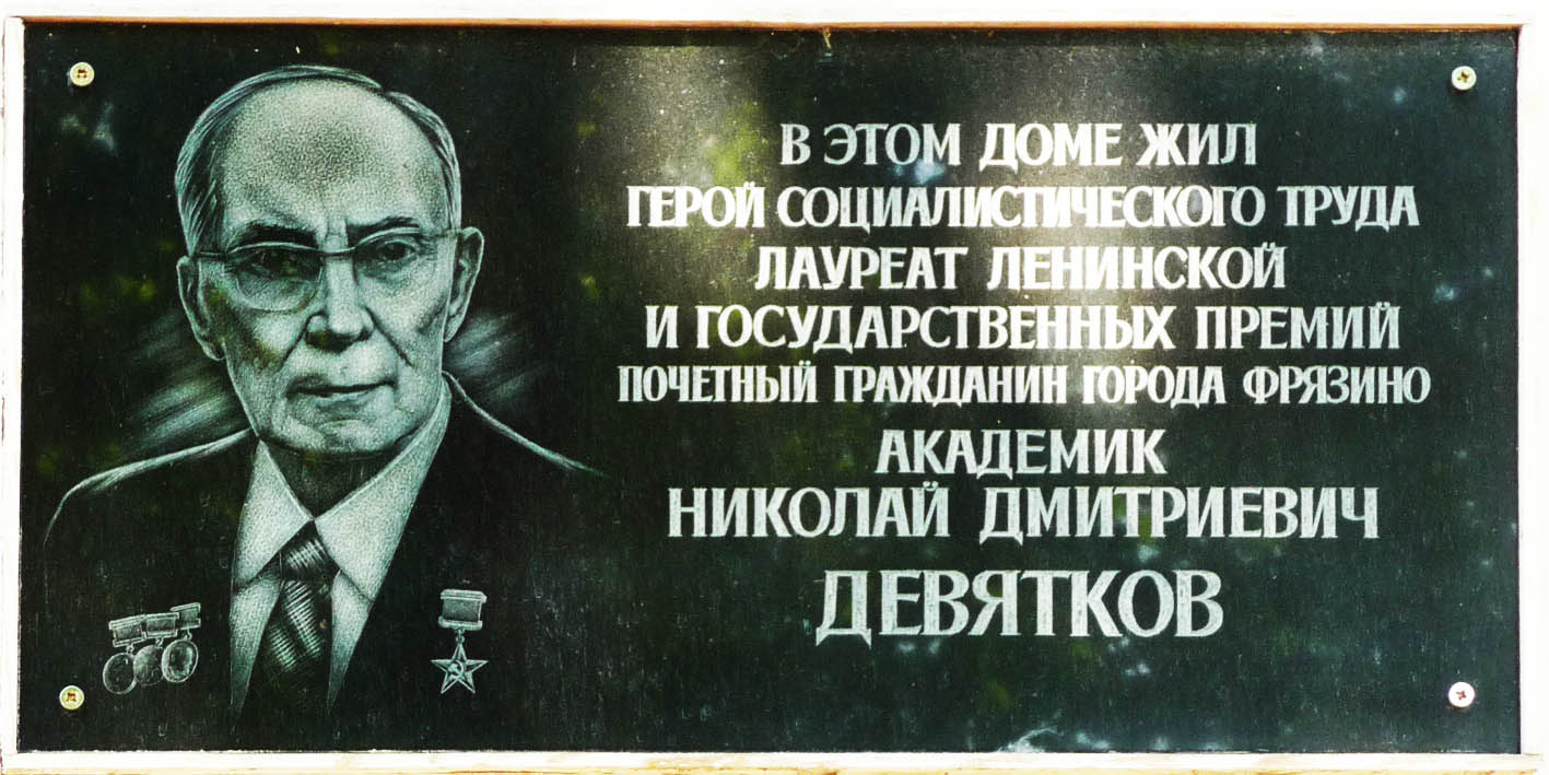 English: The memorial board established on the house where there lived Nikolay Devyatkov. Vokzalnaya str., 19, Fryazino, Moscow oblast, Russia.