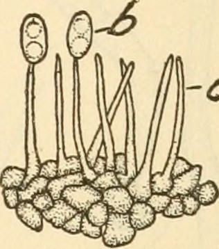 English: Fig. 2. — Diaporthe phaseolorum: Long, slender, fragile sporophores with two pycnospores attached, (a) Sporophores; (6) pycnospores. X500. |