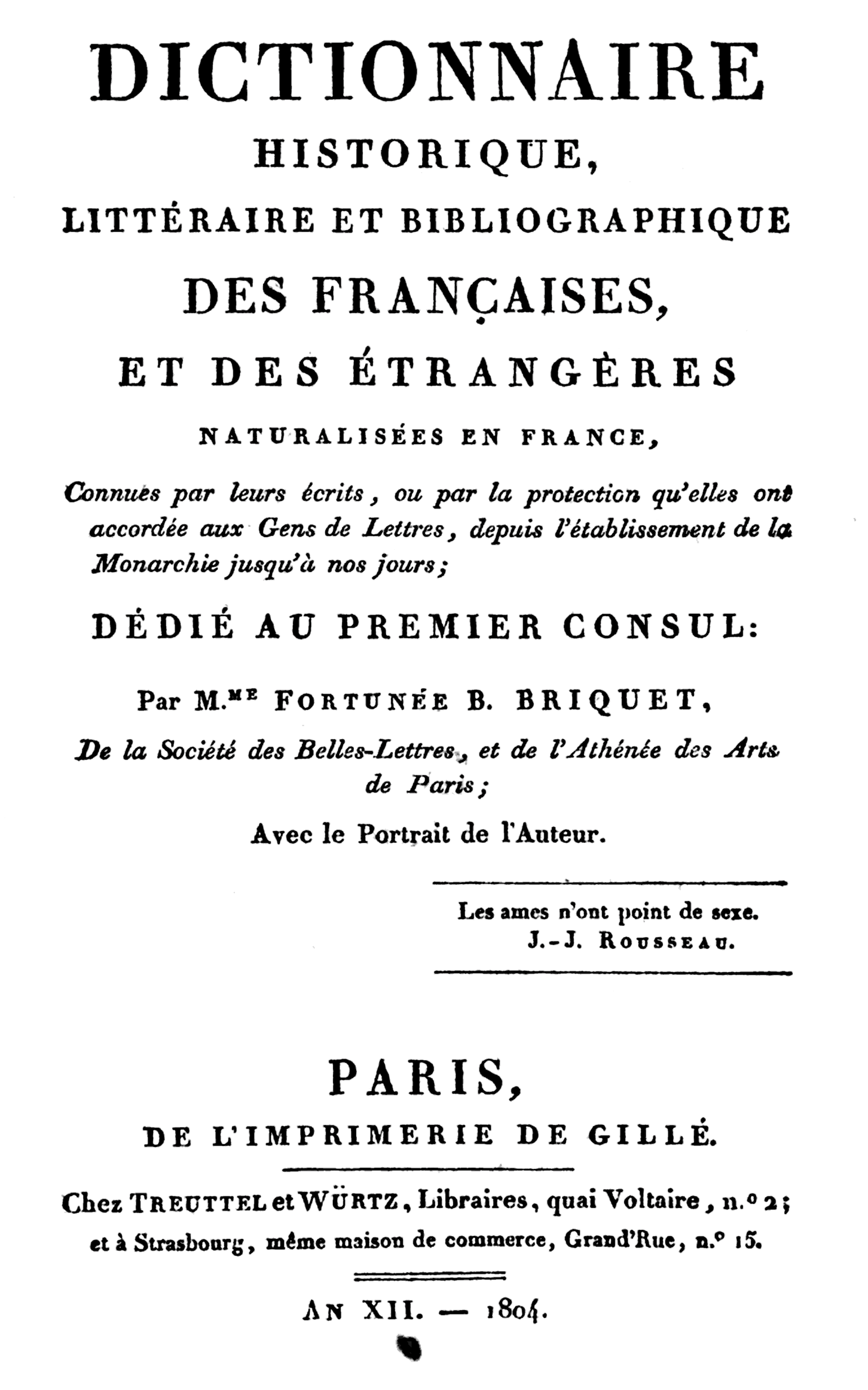 English: Title page from the first edition of Fortunée Briquet's 'Dictionnaire historique, littéraire et bibliographique des Françaises et des étrangères naturalisées en France, connues par leurs écrits ou par la protection qu'elles ont accordée aux Gens de Lettres, depuis l'établissement de la Monarchie jusqu'à nos jours'.