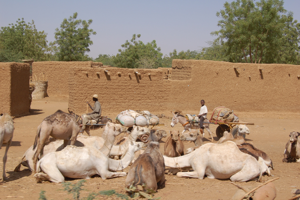 English: Along the highway in Diffa Region. Banco houses in the background, camels rest, while boys drive mule carts. |