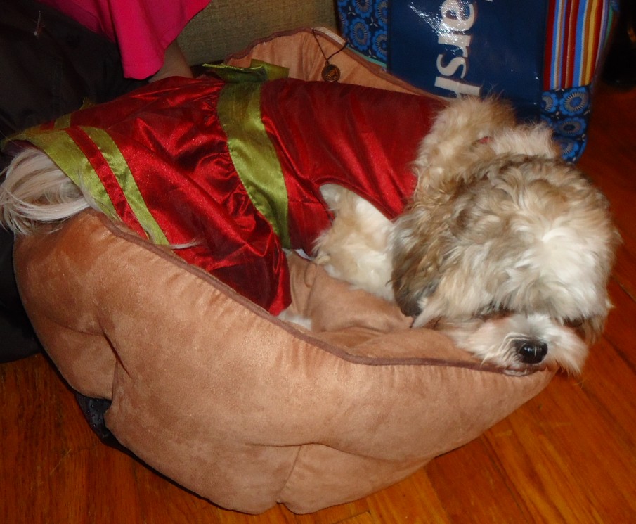 English: Dog clothed in Christmas attire, sleeping in a dog bed. |