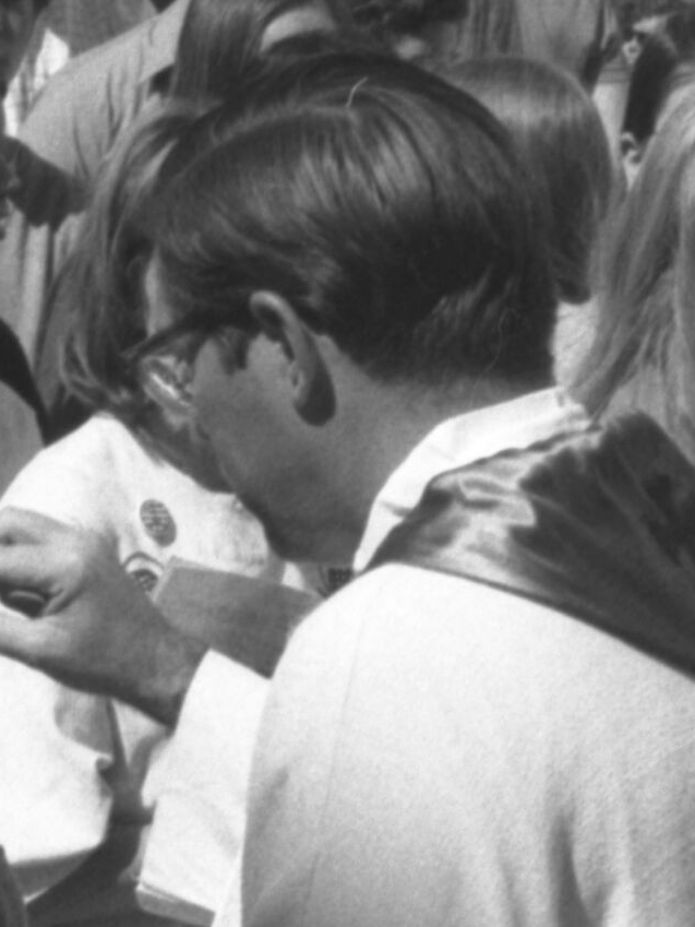 English: PEACE MASS--The Rev. Donald P. Merrifield, the president of Loyola University, holds communion following a march of Loyola and Marymount College students through Westchester to protest war. |