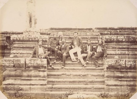 English: Group portrait of Captain Ernest Doudart de Lagrée and other members of the Commission d'exploration du Mékong, Angkor Wat, Siam (now in Cambodia), 1866. Albumen print by Emile Gsell. From left to right: Lieutenant Francis Garnier (1839 - 1873) (second in command); Lieutenant Louis Delaporte (1842 - d. 1925) (draughtsman and watercolourist); Drs. Clovis Thorel (1833 - 1911) and Lucien Joubert (b. 1832 - d. 1893) (navy physicians, in charge of geology, anthropology and botany), on either side of the leader of the expedition; Captain Doudart de Lagrée (1823 - 1868) (in white pants); Louis de Carné (b. 1844 - d. 1870 or 1871) (attaché, French Ministry of Foreign Affairs). |