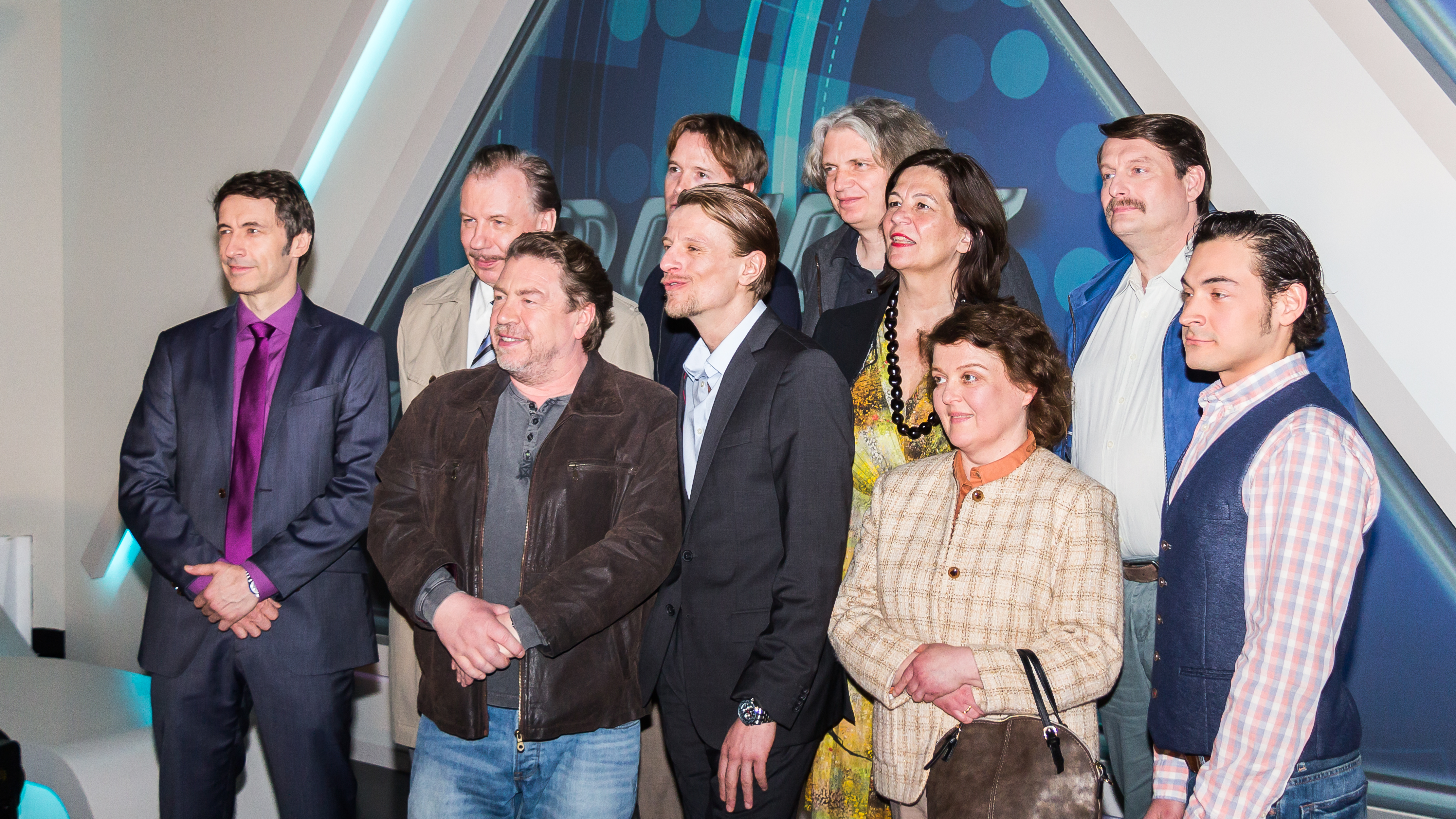 Deutsch: Dreharbeiten zu „Schnitzel geht immer“ (eine Produktion der Bavaria Fernsehproduktion GmbH, Niederlassung Köln (Produzenten Gabriele Graf und Oliver Vogel) im Auftrag des WDR). Pressetermin in der Kulisse der fiktiven Quizsendung „Quizdoppel“. Drehort: Studio auf dem WDR-Gelände Bocklemünd Foto: Gruppenbild der Schauspieler mit Produzenten und WDR-Redaktion |