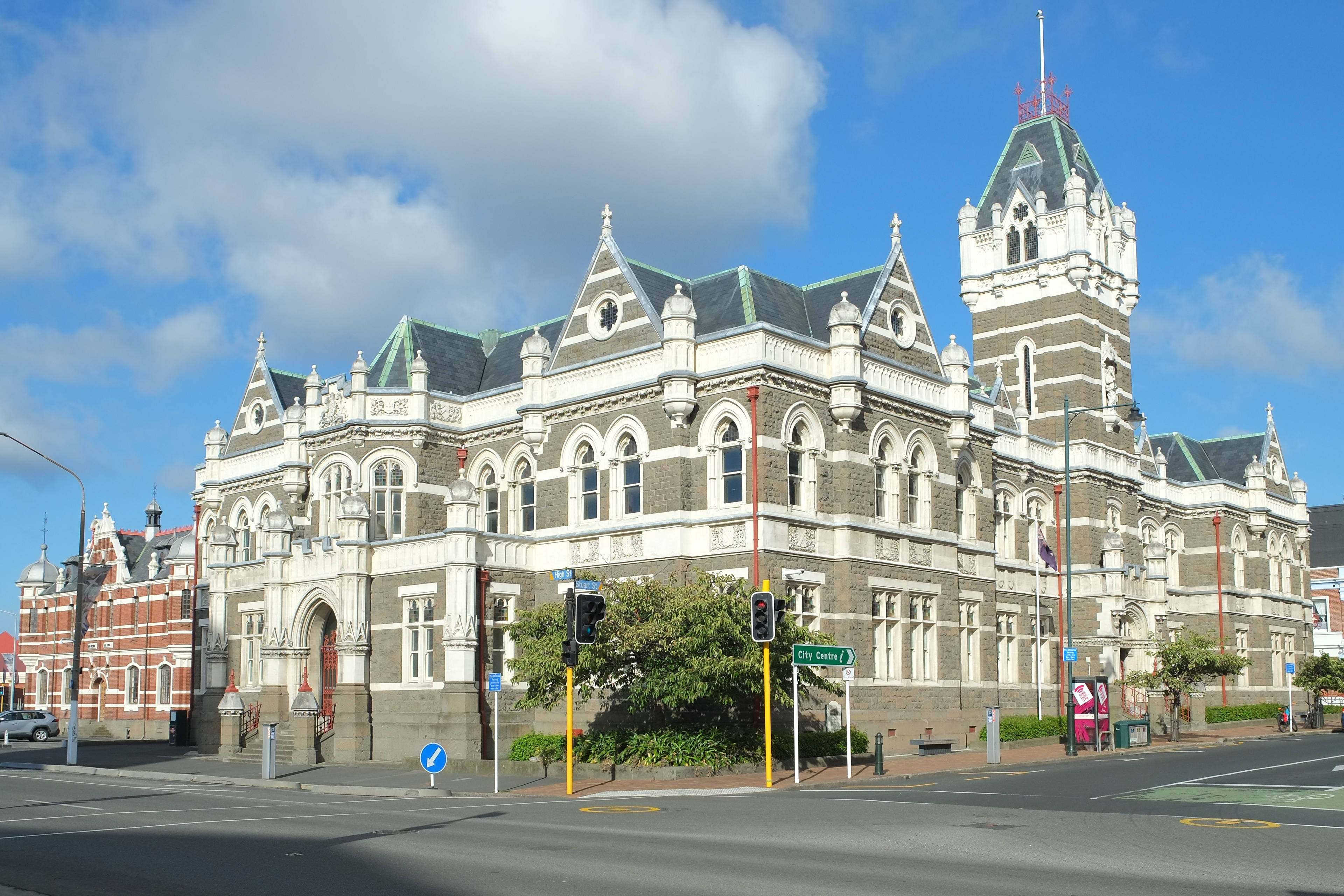 | Description | Dunedin Law Courts building on the corner of Stuart Street and High Street (southbound SH1), the former Dunedin Prison building in red brick on the far left |