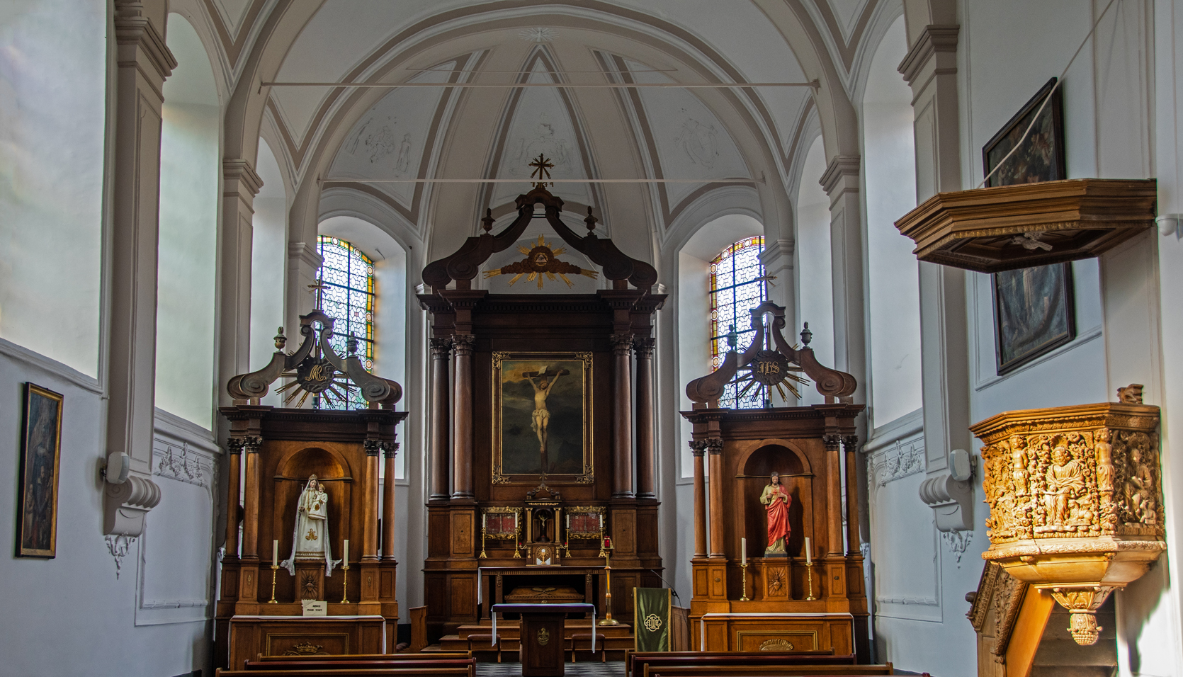 English: Durbuy, Belgium. Castle - Church – Récolletine dwellings. In 1663 the Récollectine nuns built a convent in Durbuy. In 1792 they were driven out by French revolutionaries. They run a boarding school for young girls of wealthy families. The current castle (private property) was built around 1880 on the ground where the castle of Durbuy has always stood. Texts about the latter castle go back to the 11th century. The church of Saint-Nicolas was constructed in 1632 and enlarged in 1774. The pulpit is in the baroque style. قالب:Wiki Loves Heritage Belgium in 2022 type-region |