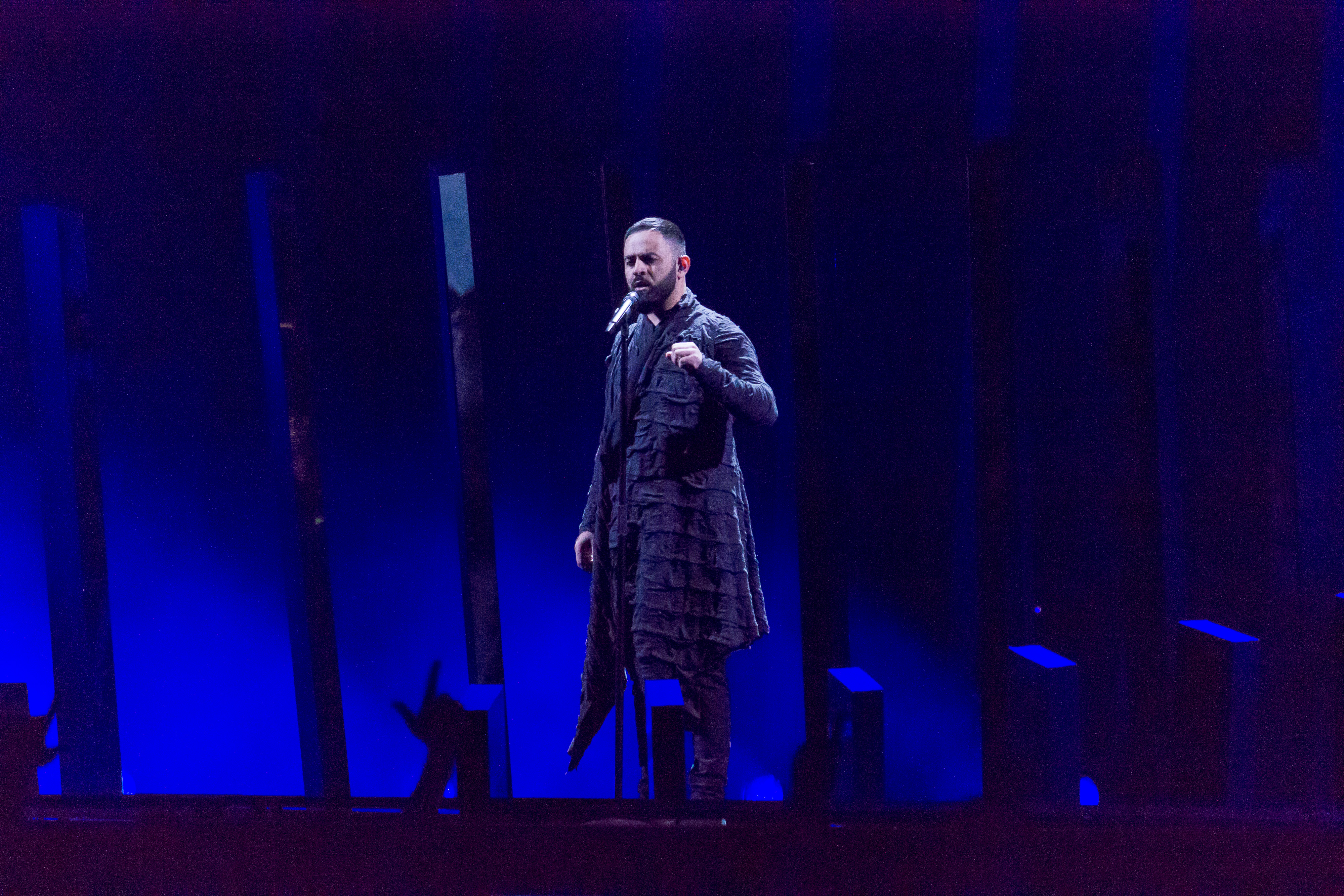 English: Sevak Khanagyan representing Armenia with the song "Qami" during a rehearsal before the first semi final of the Eurovision Song Contest 2018 in Lisbon. |