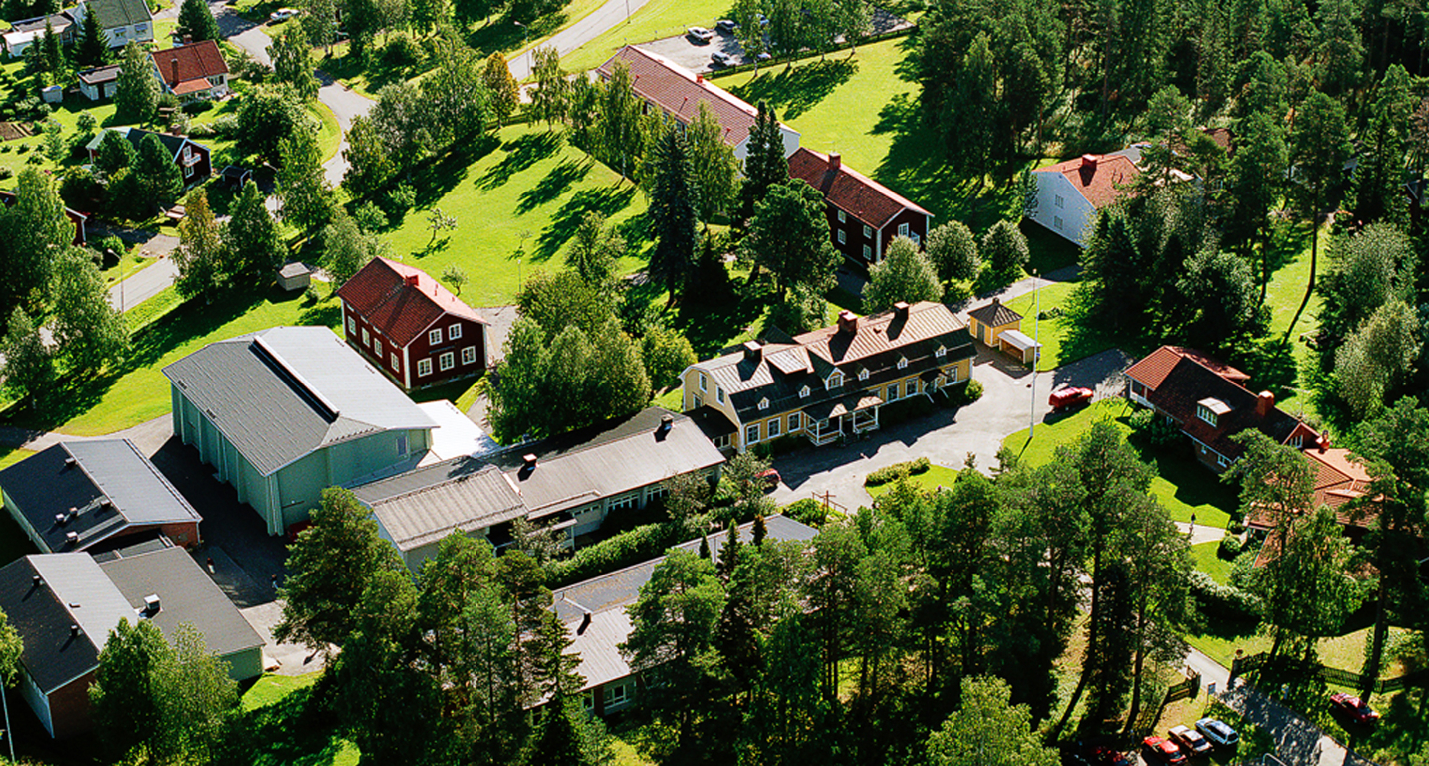 Svenska: Flygbild över hela Edelviks folkhögskola med skolbyggnader, herrgård och internatboenden.
