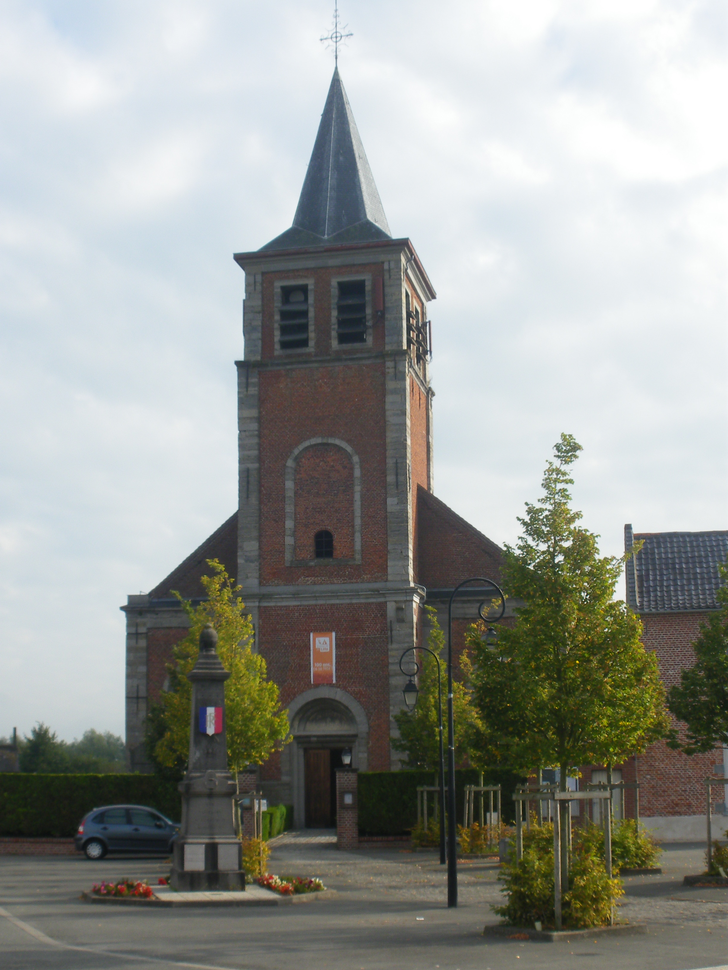 Français : Vue de l'église Saint-Pierre et du monument aux morts de la commune de Mouchin.