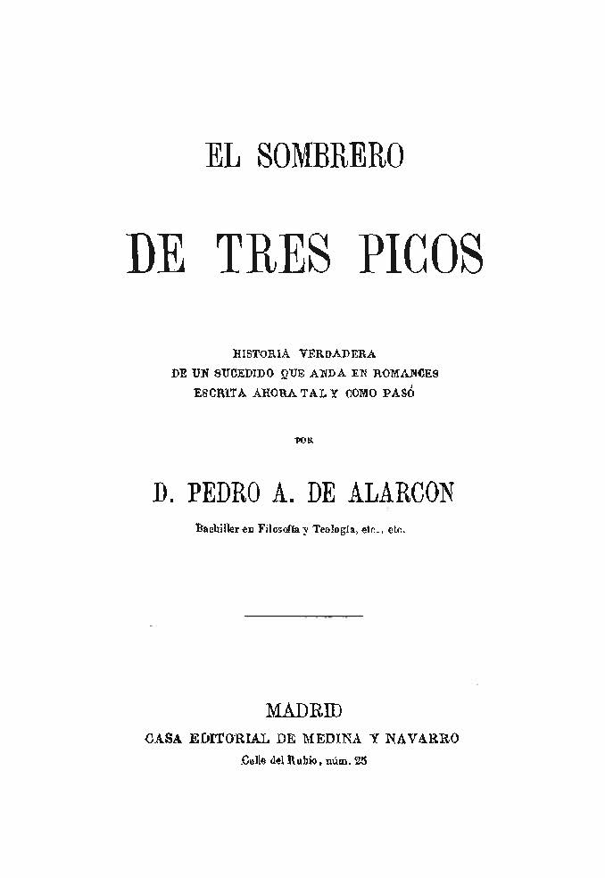 Español: Portada de la novela El sombrero de tres picos, escrita por Pedro Antonio de Alarcón. Madrid: Casa Editorial de Medina y Navarro. |