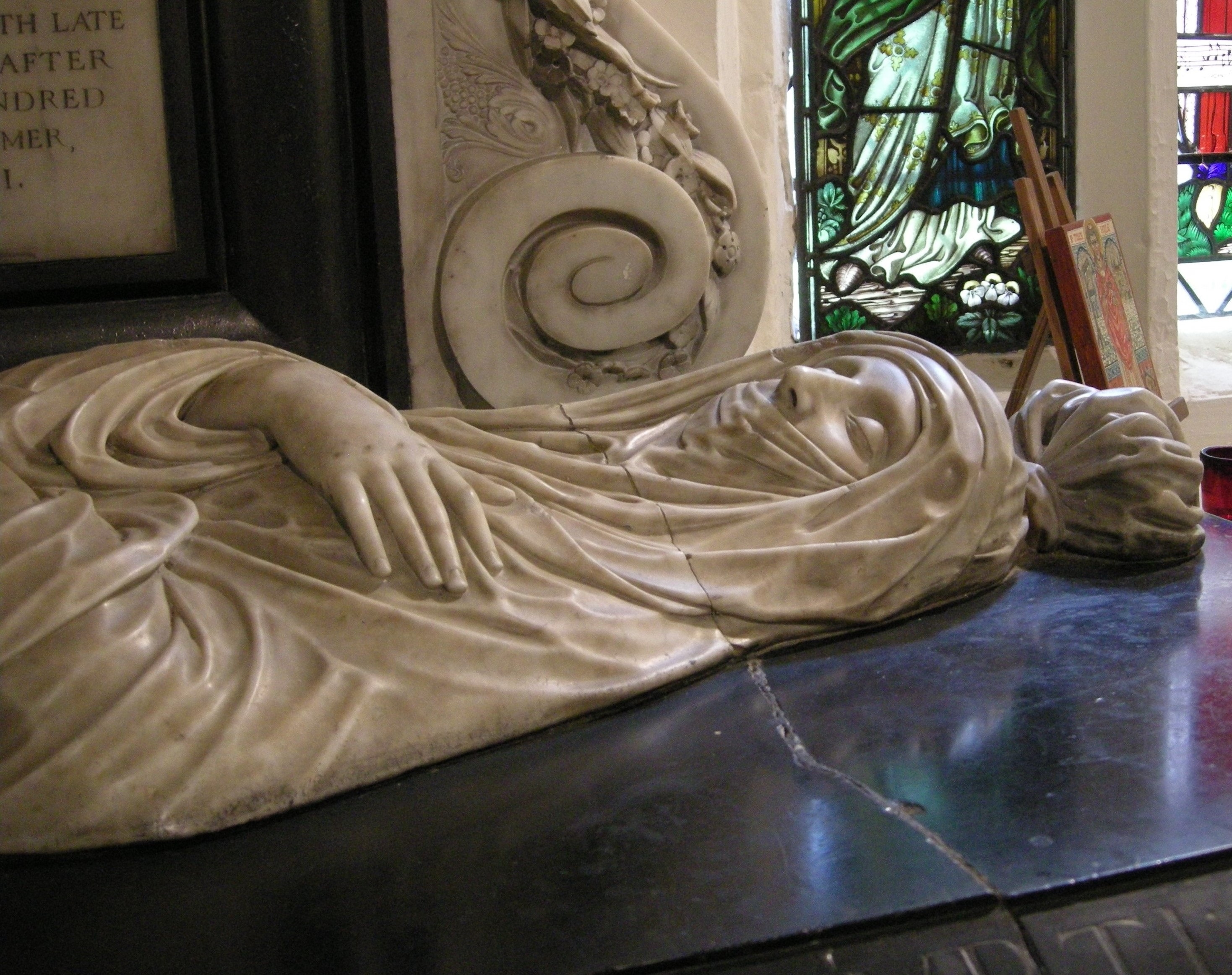 English: Tomb effigy of Elizabeth, Lady Berkeley (d. 23 April 1635) in St Dunstan's church, Cranford, Middlesex, sculpted by Nicholas Stone. |