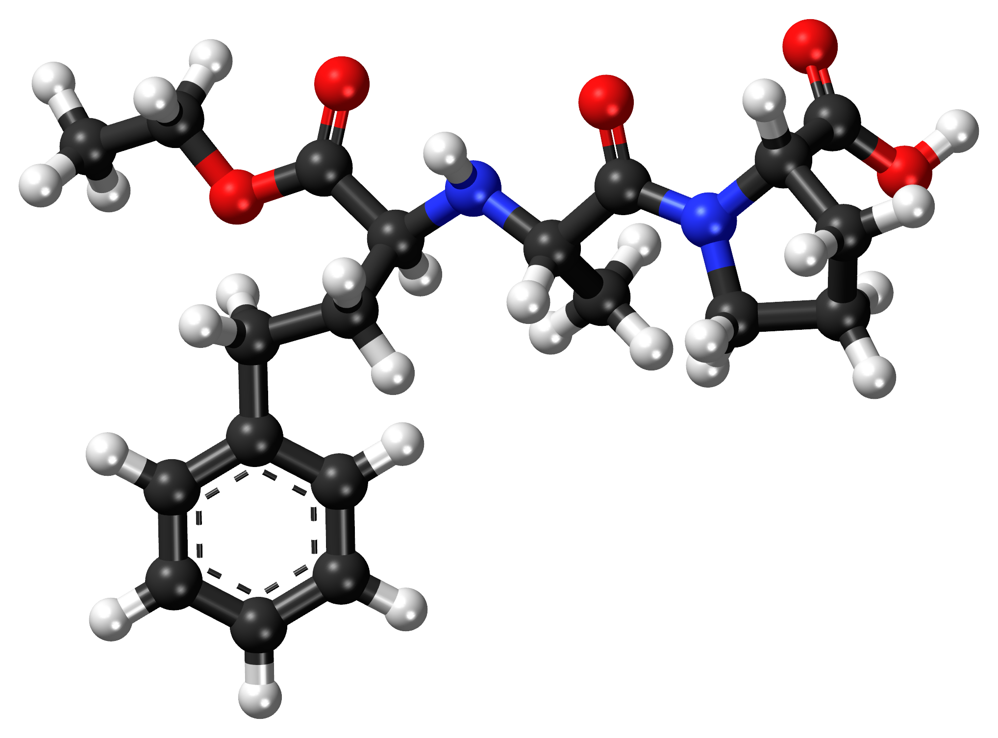 English: Ball-and-stick model of enalapril, an ACE inhibitor. Created using Accelrys DS Visualizer 4.1 and Adobe Photoshop CC 2015.