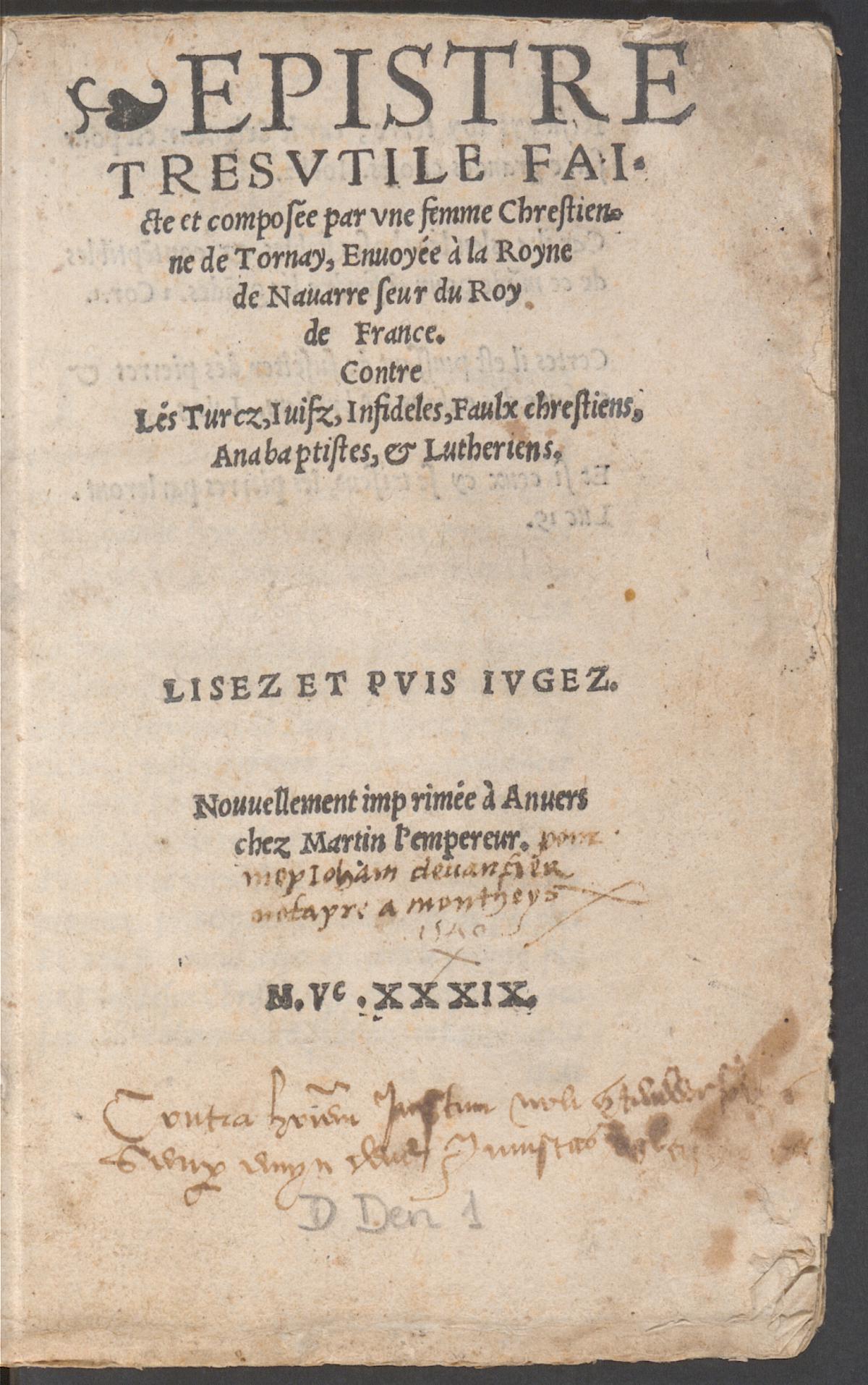 English: Portada de la Epistre tresutile… de Marie Dentière, publicada en Amberes en marzo de 1539. |