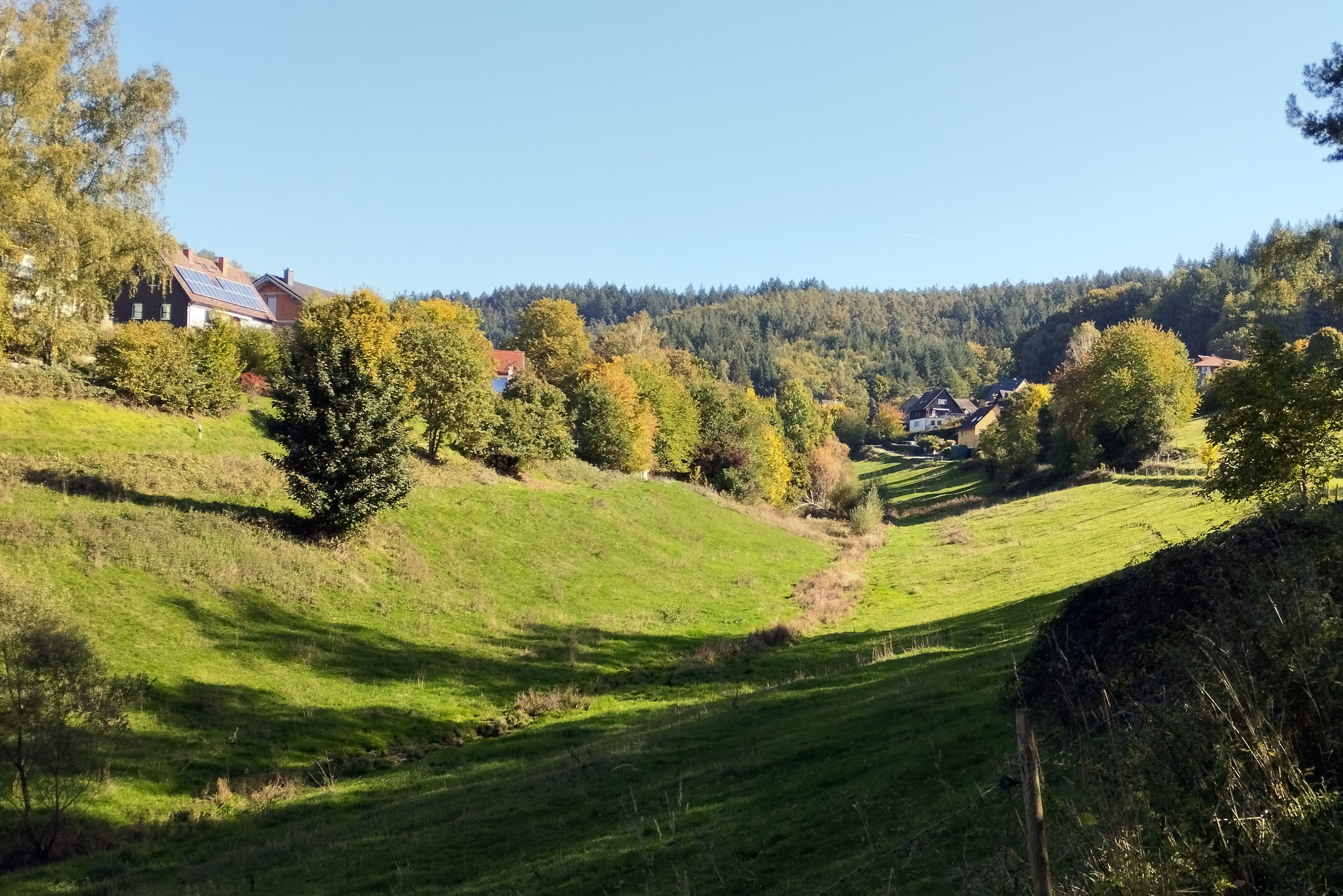 English: valley of the brooke "Erbucher Bach" and the village Erbuch, part of the town Erbach (Odenwaldkreis, Hesse, Germany)