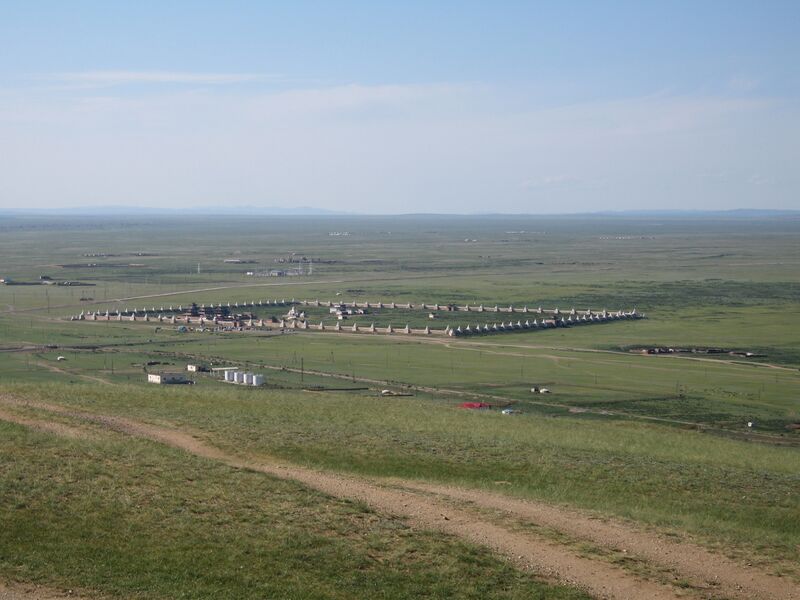 English: The en:Erdene Zuu monastery in en:Mongolia. Site of the ancient Karakorum behind the monastery, to the right (dark green area) |