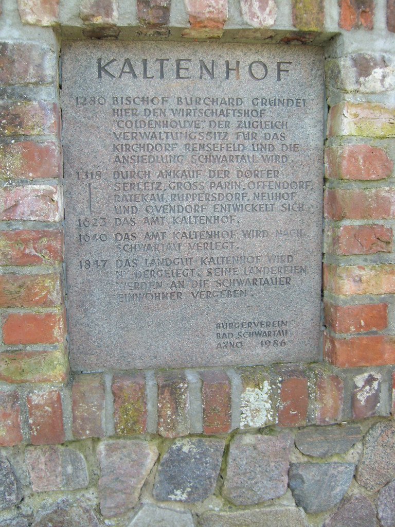 - 2007-07-01 17:32 Kresspahl 768×1024× (243119 bytes) {{Information |Beschreibung = Erinnerungstafel für den mittelalterlichen Kaltenhof bei Bad Schwartau |Quelle = eigene Aufnahme |Urheber = Benutzer Kresspahl |Datum = Mai 2007 |Genehmigung = Panoramafreiheit |Andere Versionen = |Anmerkungen = }}