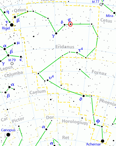 | [This is a retouched picture, which means that it has been digitally altered from its original version. Modifications: placing a red circle around the star ε. The original can be viewed here: Eridanus constellation map.png.] Error: {{Lang}}: text has italic markup (help)