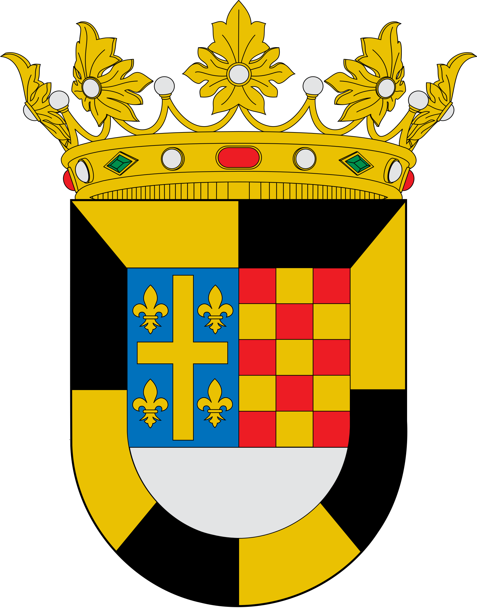 Español: Escudo de Lalueza-Huesca. Escudo cuadrilongo de base circular. Partido: 1º Cuartel, de azur, cruz llana, recortada, de oro, cantonada de cuatro flores de lis del mismo metal. 2º Cuartel jaquelado de oro y gules en 3 x 5 órdenes. La punta de plata. Bordura general componada de ocho piezas de oro y sable. Al timbre, Corona Real abierta.Source:[1] |