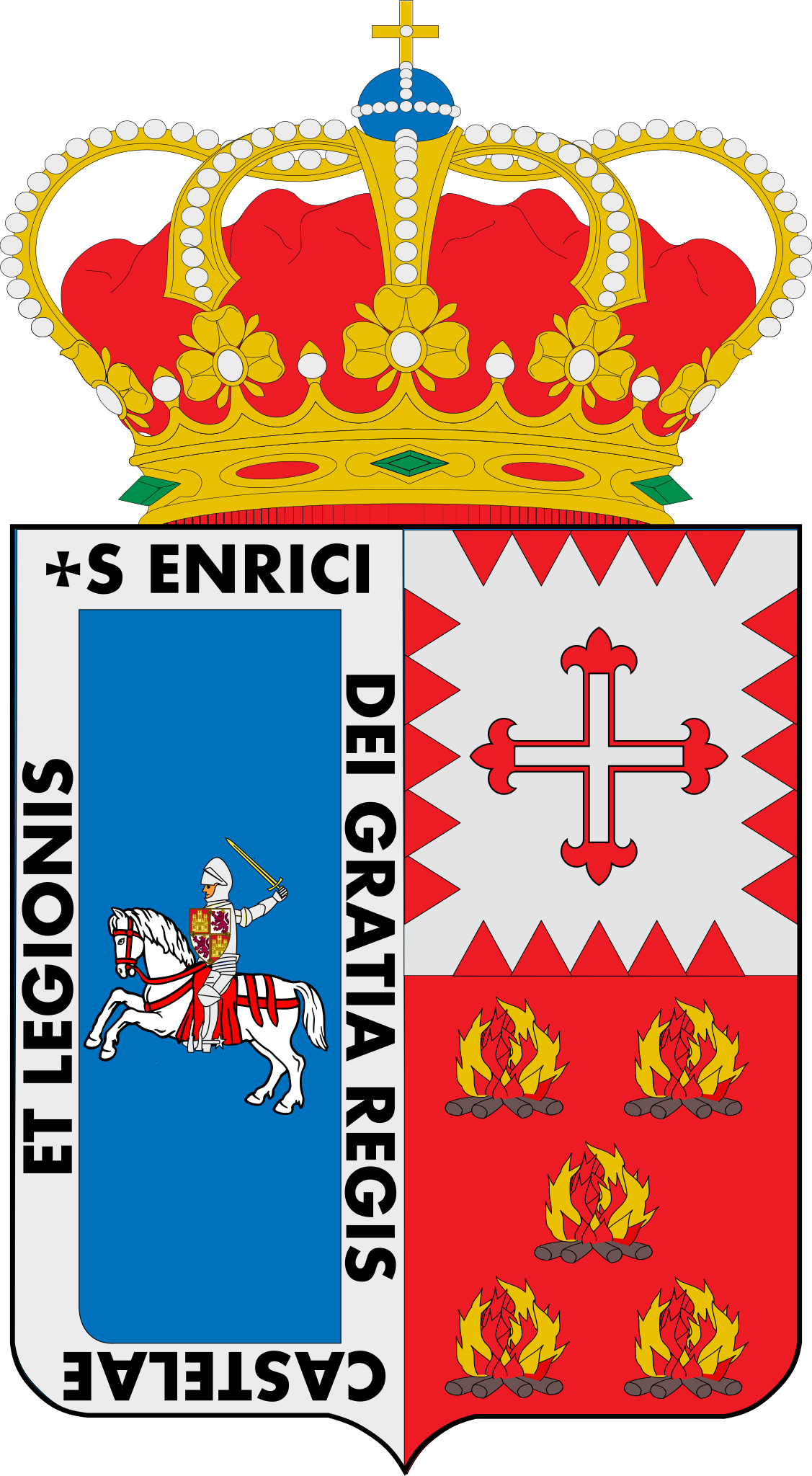 Español: Partido y medio cortado. El cuarto partido de la izquierda es doble y representa la figura de Enrique III de Castilla en caballo con la inscripción; "S ENRIQUI DEI GRATIA REGIS CASTELAE LEGIONIS", en honor de los dos privilegios que éste concedió al pueblo. El cuarto partido de la derecha se divide en dos, estando en la parte superior la cruz del escudo de los Caso, que fueron alférez mayores de Ponga. En el cuartel partido, cinco llamas sobre fondo rojo que es el escudo de la familia Cienfuegos, titulares del condado de Peñalba, que sucedieron a la familia Caso. |