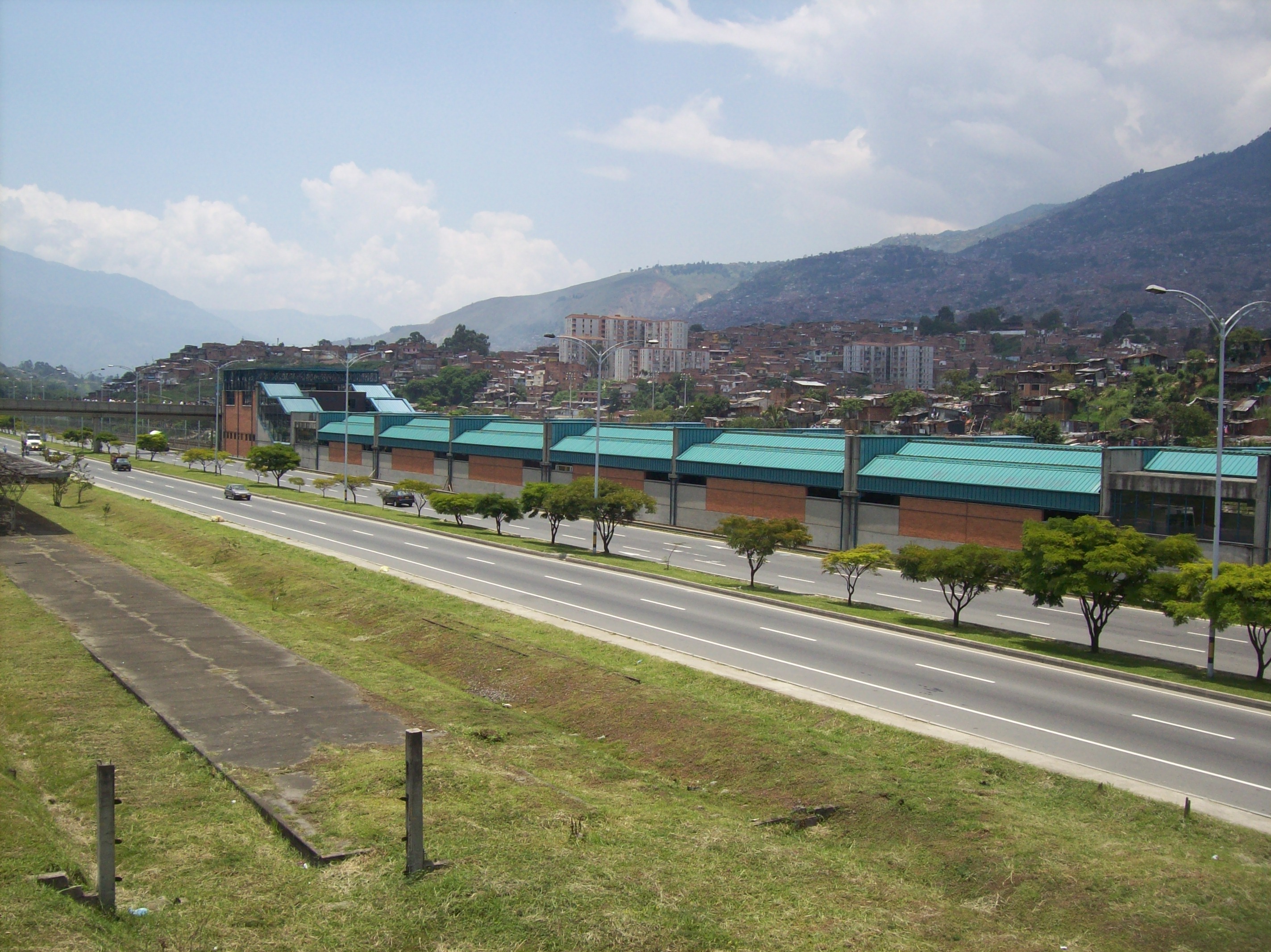 Español: Aspecto externo de la Estación Caribe del Metro de Medellín desde la salida occidental del acceso sur. Tras la estación se encuentran el Río Medellín y Aranjuez (visible). En la parte inferior izquierda se aprecian las ruinas del Ferrocarril de Antioquia; y en la parte derecha, la fachada de la Iglesia de Nuestra Señora del Consuelo (de espadaña blanca con una cruz pintada. |