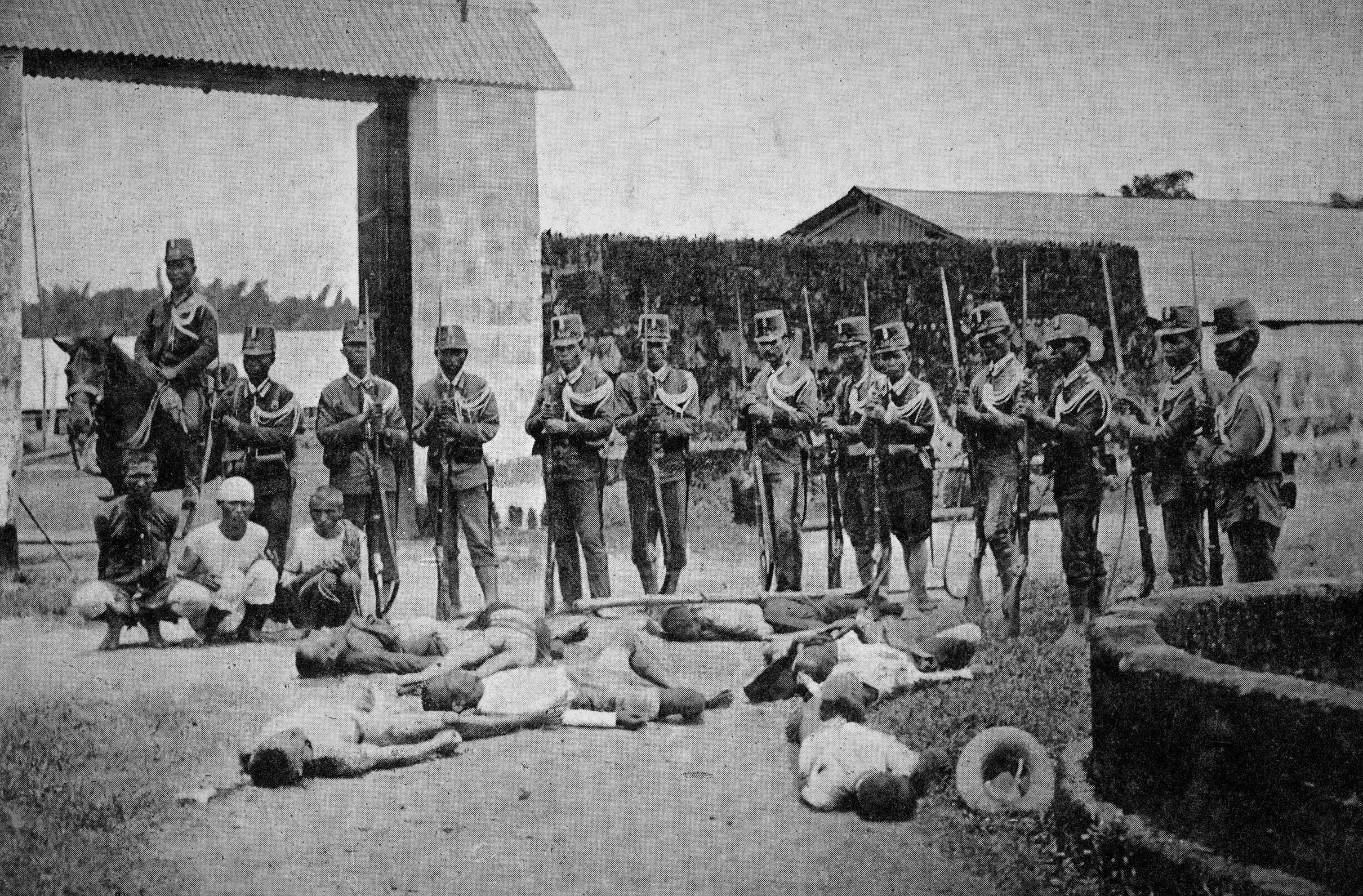 Español: Fusilamientos de varios filipinos revolucionarios durante la guerra hispano-estadounidense de 1898. Los ejecutores son Filipinos leales al Reino de España, y llevan uniformes del ejército español. قالب:Retouched |