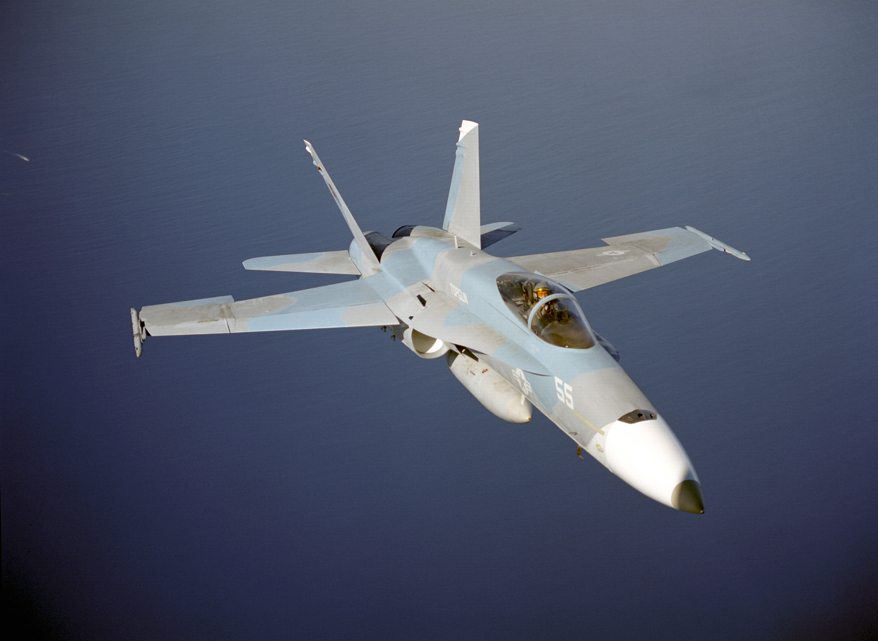 | Description | An aerial of F/A-18 Hornet from the TOPGUN school over water. |