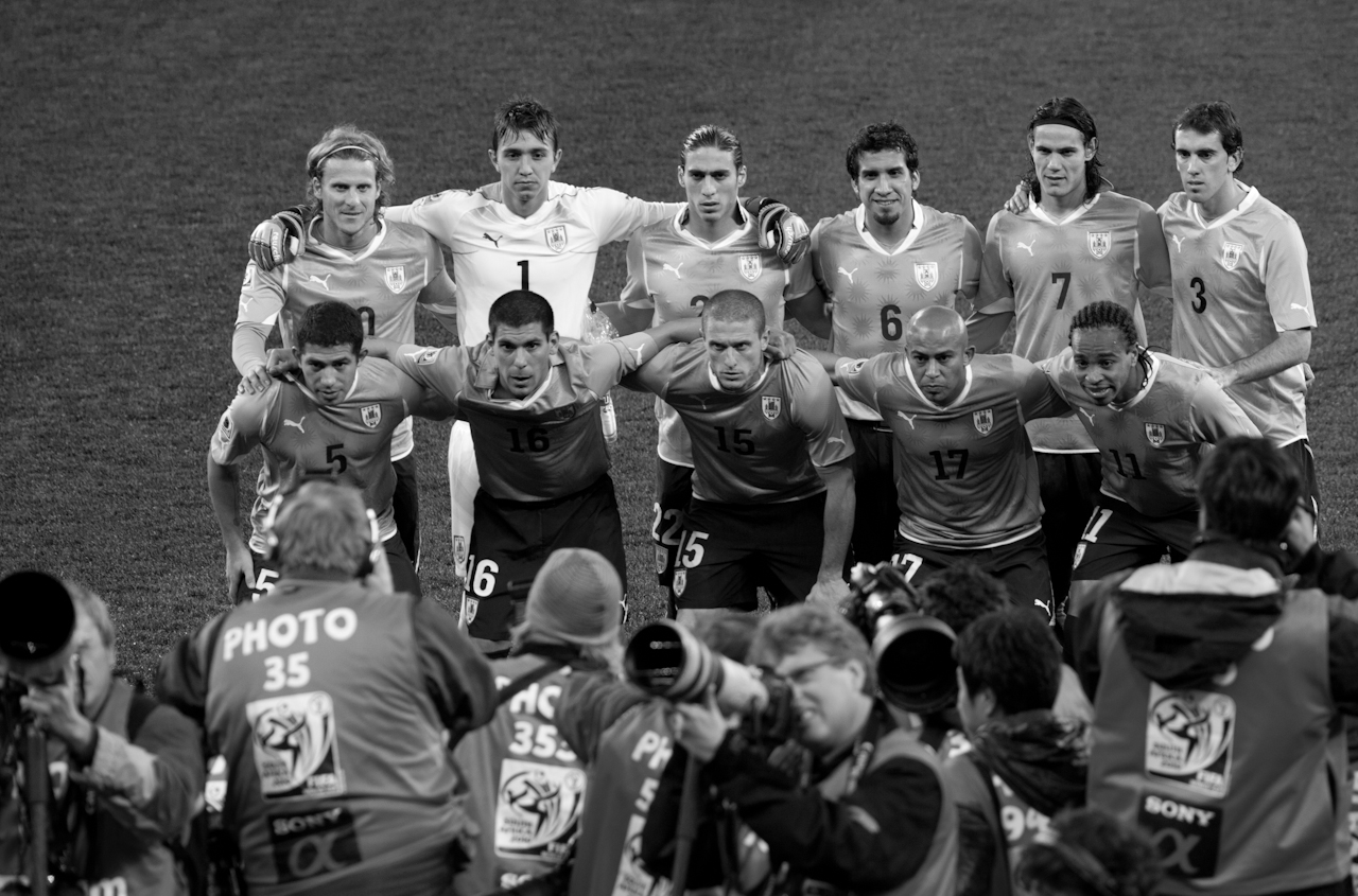 English: Uruguay national football team before semifinal of FIFA World Cup 2010 against Netherlands, 6 July 2010. Forlan, Muslera, M. Cáceres, M.Victorino, Cavani, Godin; Gargano, Maxi Pereira, Ruso Perez, Arevalo Rios, Palito Pereira. |