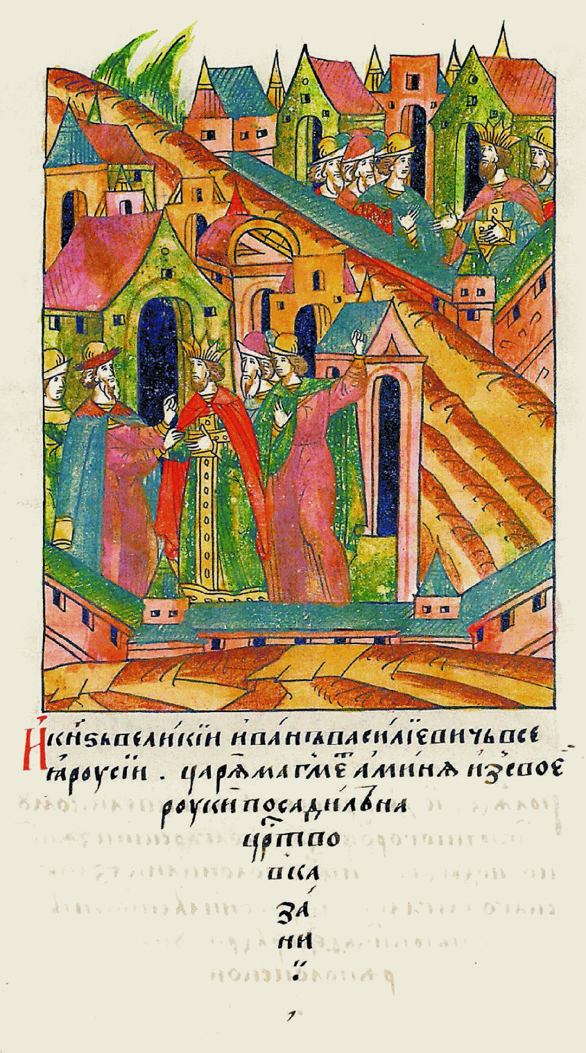 И великий князь Иван Василье- вич всея Руси царя Магамет-Амина по своей воле посадил на царство в Казани, |