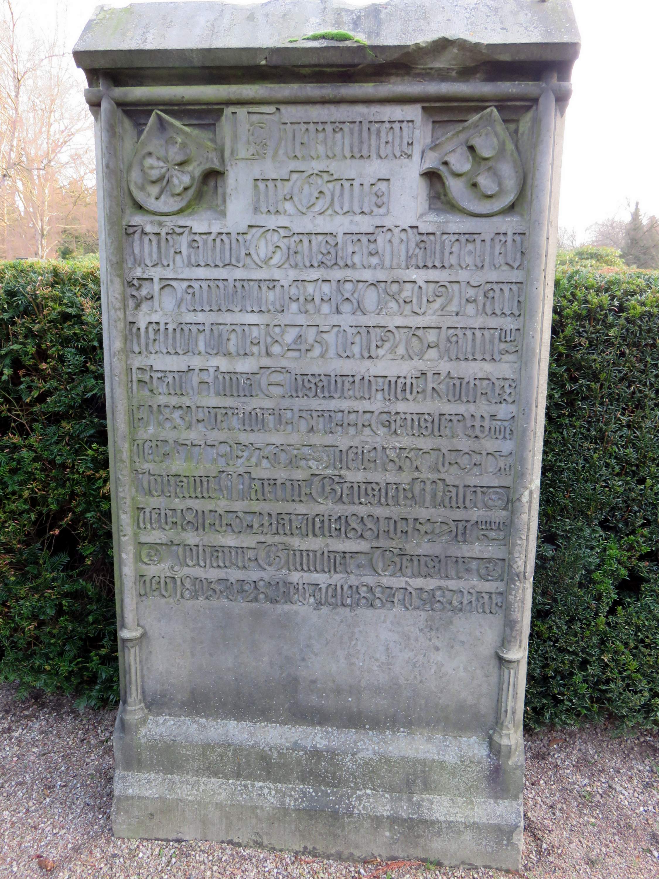Deutsch: Grabmal für die Maler Johann Günther Gensler (1803-1884), Joh. Jakob Gensler (1808-1845) und Johann Martin Gensler (1811-1881) im Grabmal-Freilichtmuseum Heckengarten auf dem Hamburger Friedhof Ohlsdorf. Inschriften bei genealogy.net.