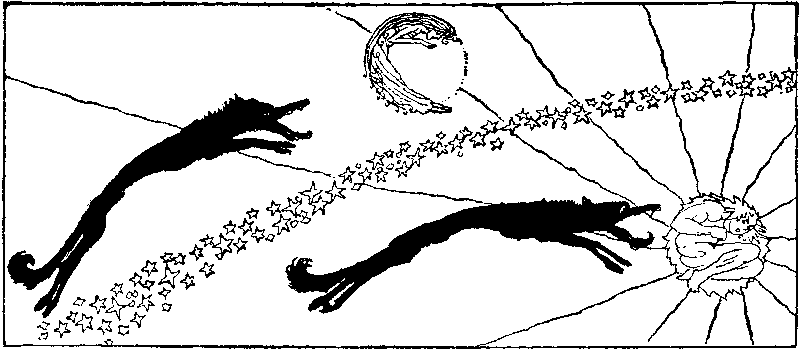 | Description | An illustration by Willy Pogany from a chapter from Children of Odin entitled "How Loki wrought mischief on Asgard". No title otherwise given for the work. The wolf Sköll chases the personified sun, Sól, and his brother Hati Hróðvitnisson chases the personified moon, Máni, from Norse mythology. | ||