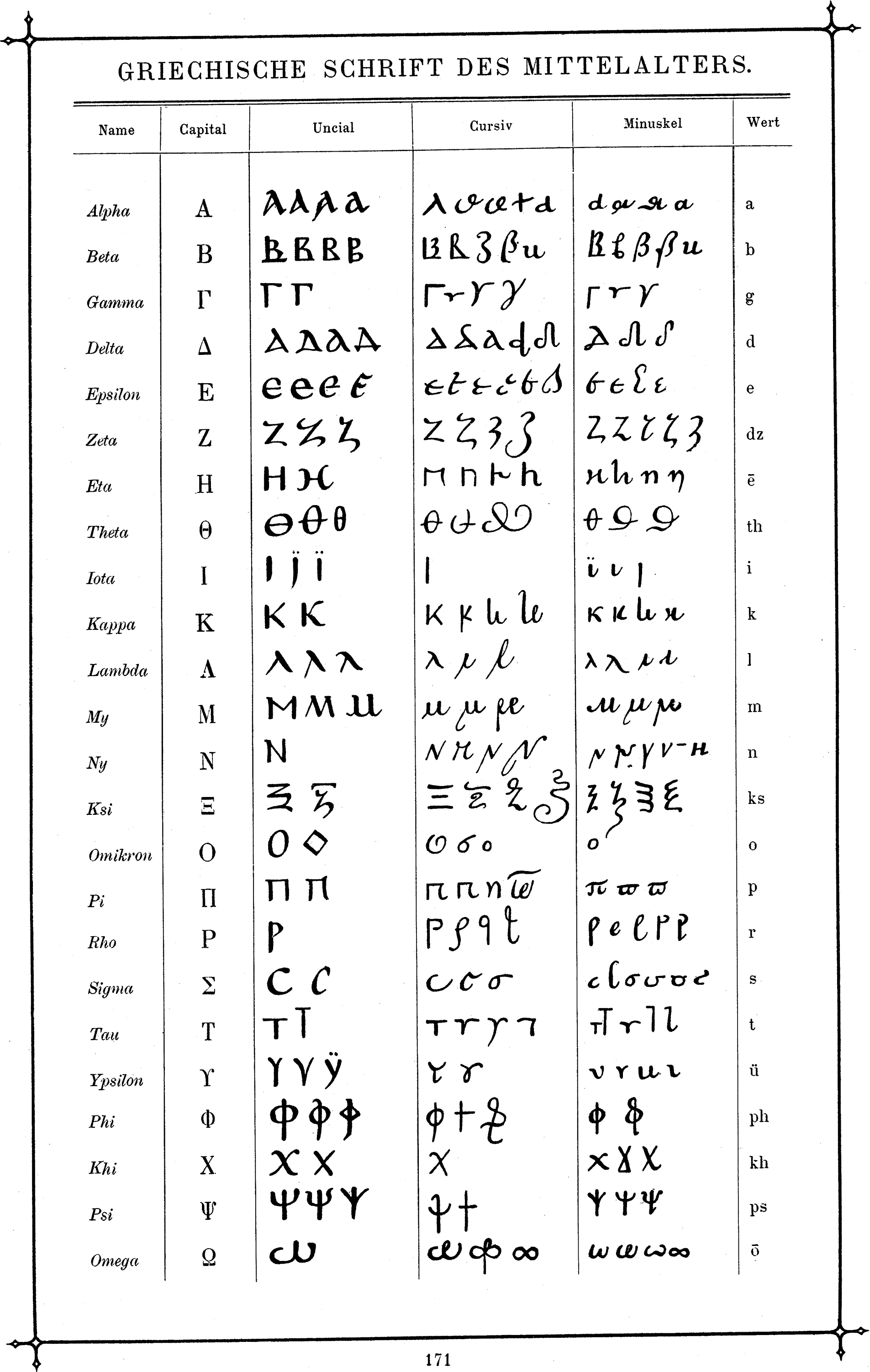 This page from Faulmann’s book shows the “Griechische Schrift des Mittelalters”, i.e. Greek medieval script letters (the uncial, a cursive and the minuscle type) as used in old manuscripts. For a biography of Carl Faulmann, see the German Wikipedia. I have scanned the page at rather high resolution so it should be possible to print it in reasonable quality (300 ppi at more or less 100% of the original size). |