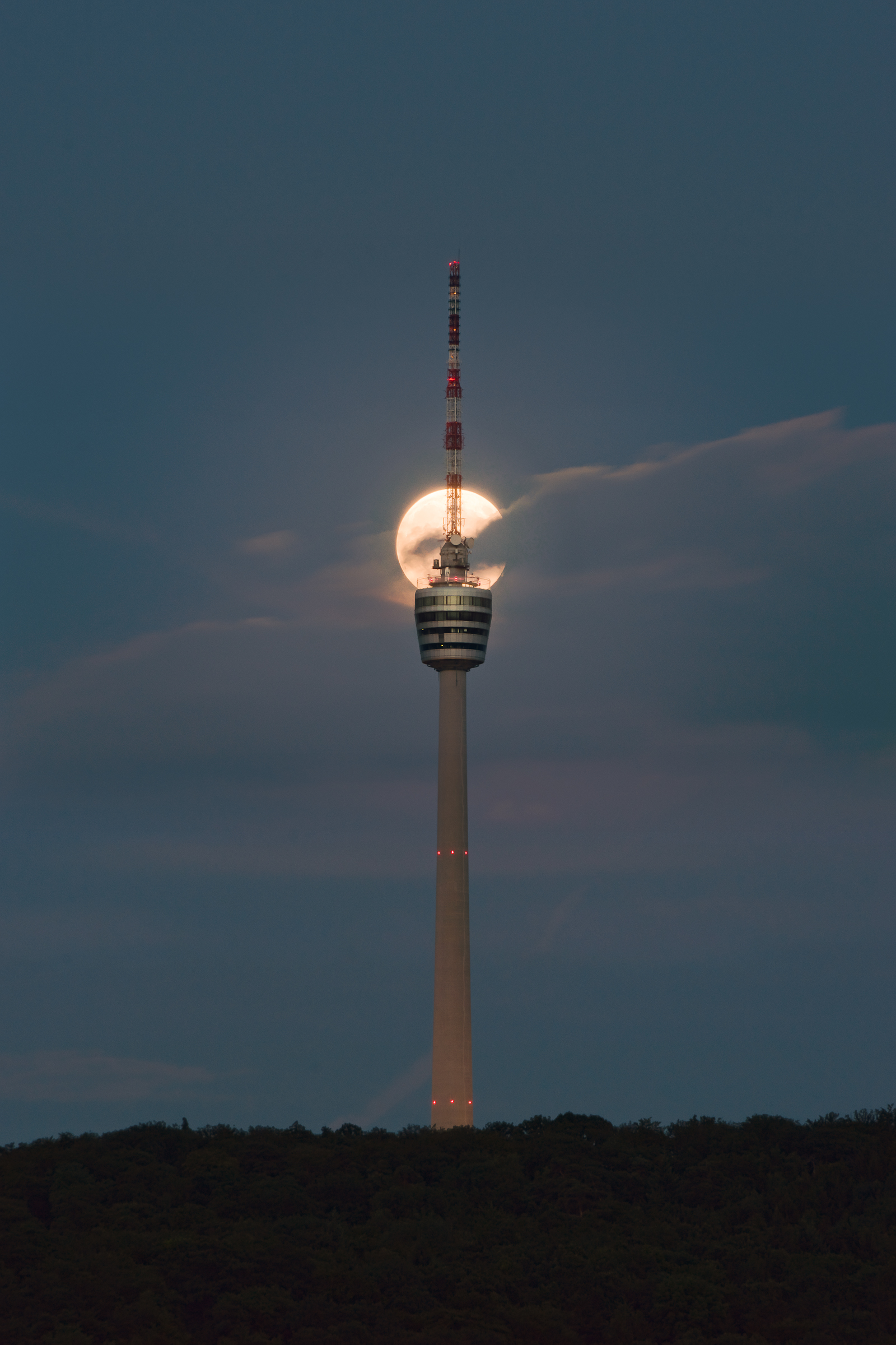 Deutsch: Der Fernsehturm Stuttgart, dahinter der aufgehende Vollmond, aus westlicher Richtung gesehen. |