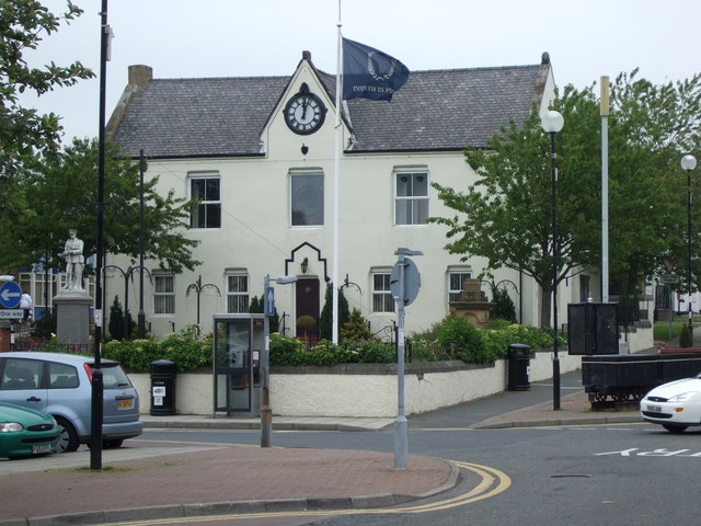 English: Ferryhill flying the flag The town hall flagpole is sporting the 'Investors in People' standard. A pity though that a fine civic building should be so excessively festooned with 'street furniture' |