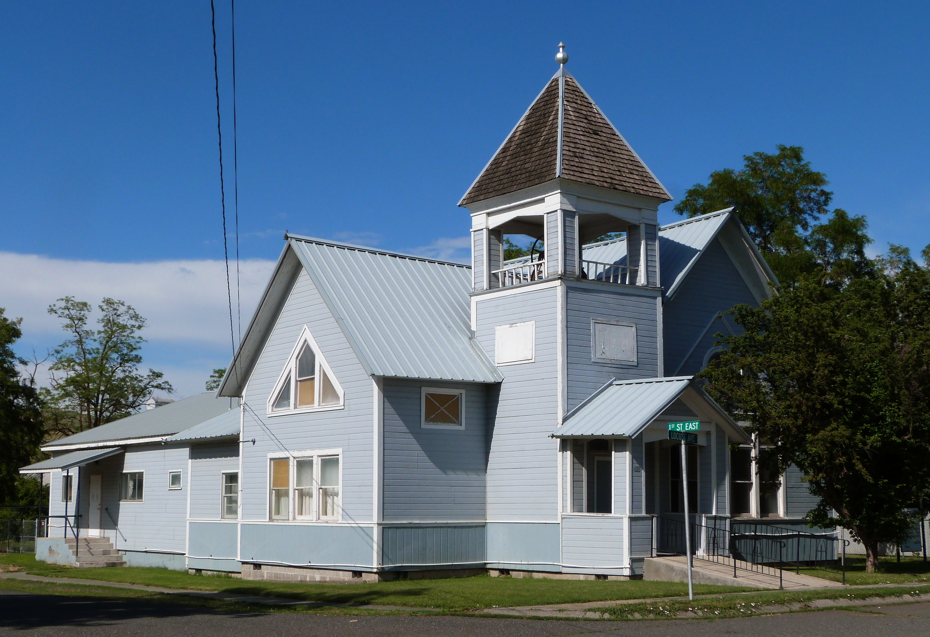 English: The historic First Presbyterian Church (built 1909), located at the intersection of Locust Avenue and 1st Street East in Lapwai, Idaho, United States, is listed on the US National Register of Historic Places. As of the photo date, it is named the Lapwai Valley Presbyterian Church. |