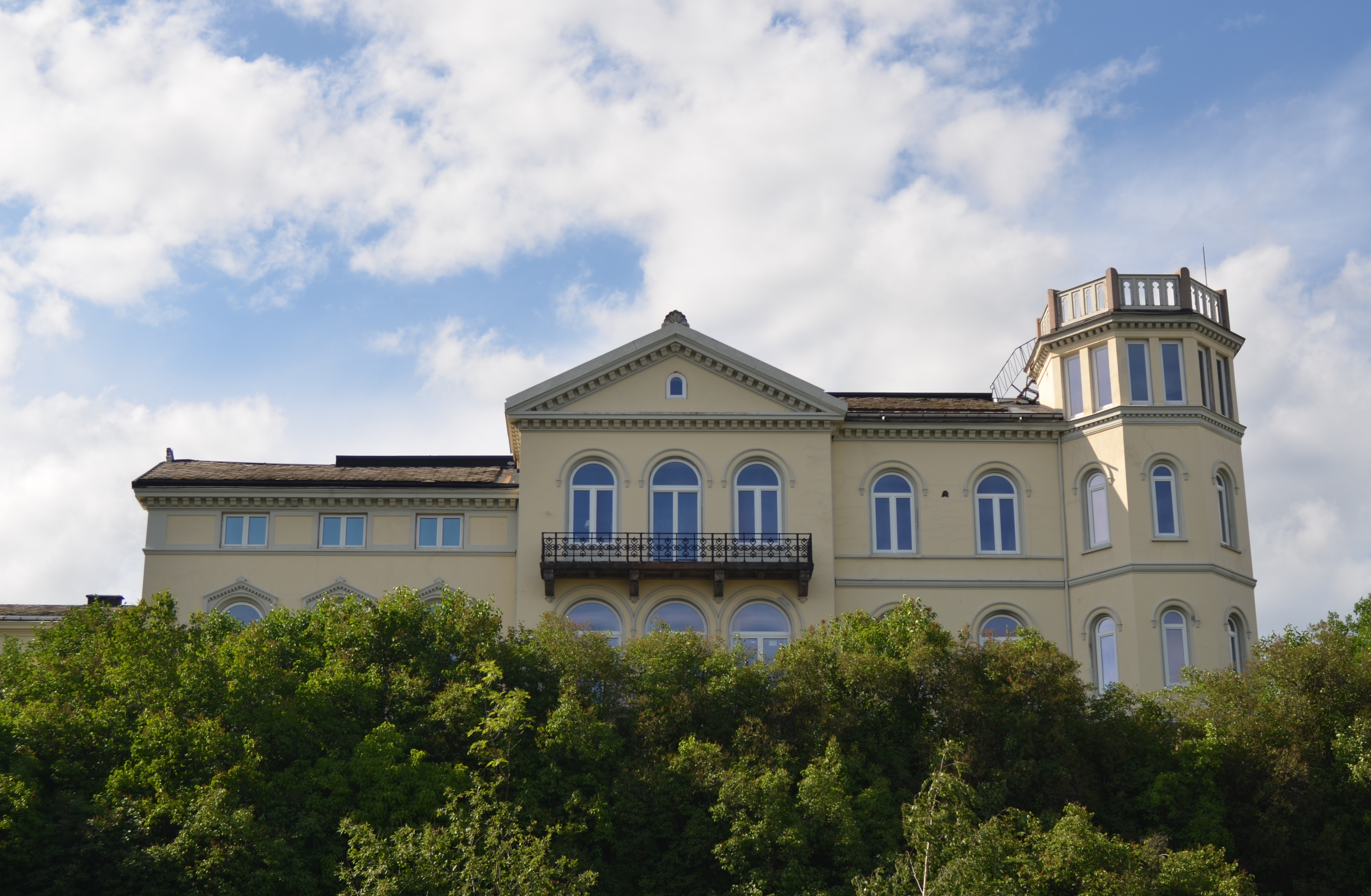English: Fjellheim manor in Drammen, designed by architect Emil Victor Langlet and constructed ca. 1870 as residence for mayor Jacob Krog Borch. The villa is made in brick and a romantic classic style, with an octagonal tower.