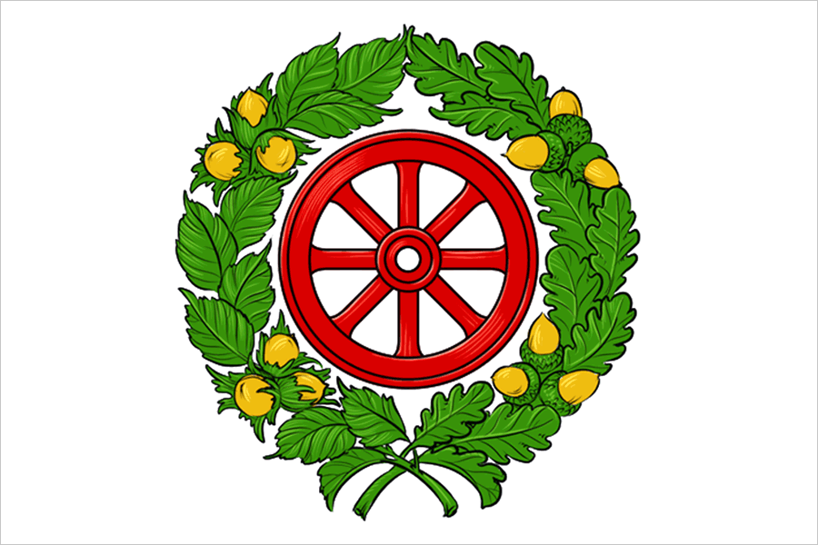 Описание герба: «В серебряном поле — червлёное колесо в венке из зелёных с золотыми плодами ореховой и дубовой ветвей».