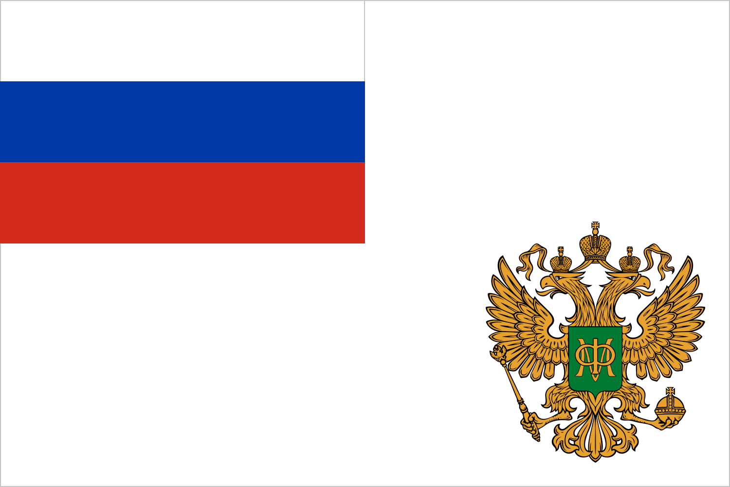 Ширина полотнища флага составляет две трети его длины. Длина и ширина изображения Государственного флага Российской Федерации составляют соответственно одну вторую длины и ширины полотнища флага Министерства финансов Российской Федерации. Высота изображения геральдического знака — эмблемы Министерства финансов Российской Федерации составляет одну вторую ширины полотнища флага, ширина — одну треть его длины. Изображение геральдического знака — эмблемы Министерства финансов Российской Федерации расположено на расстоянии одной двадцатой ширины полотнища флага от его нижнего и правого краёв». Геральдический знак — эмблема Министерства финансов Российской Федерации представляет собой изображение золотого двуглавого орла с поднятыми вверх крыльями, увенчанного двумя малыми золотыми коронами и над ними одной большой золотой короной, соединёнными золотой лентой. На груди орла — зелёный щит с золотой монограммой, составленной из литер «М» и «Ф». В лапах орёл держит скипетр и державу. |