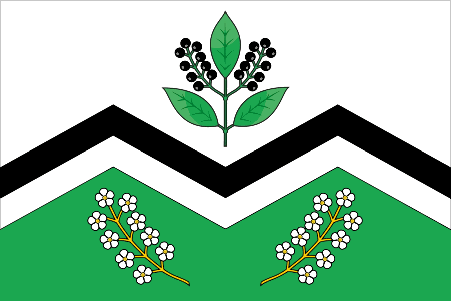Описание герба: «В понижено и зазубрено в виде двух зубцов пересеченном серебряном и зелёном поле поверх деления подобный делению поля зазубренный чёрный и серебряный пояс о двух зубцах, сопровождаемый сверху положенной в столб зелёной ветвью черёмухи о трёх листах и двух гроздях чёрных ягод, а снизу — двумя золотыми ветвями черёмухи, положенными сообразно поясу наподобие опрокинутого стропила, с серебряными цветками с золотыми сердцевинами».