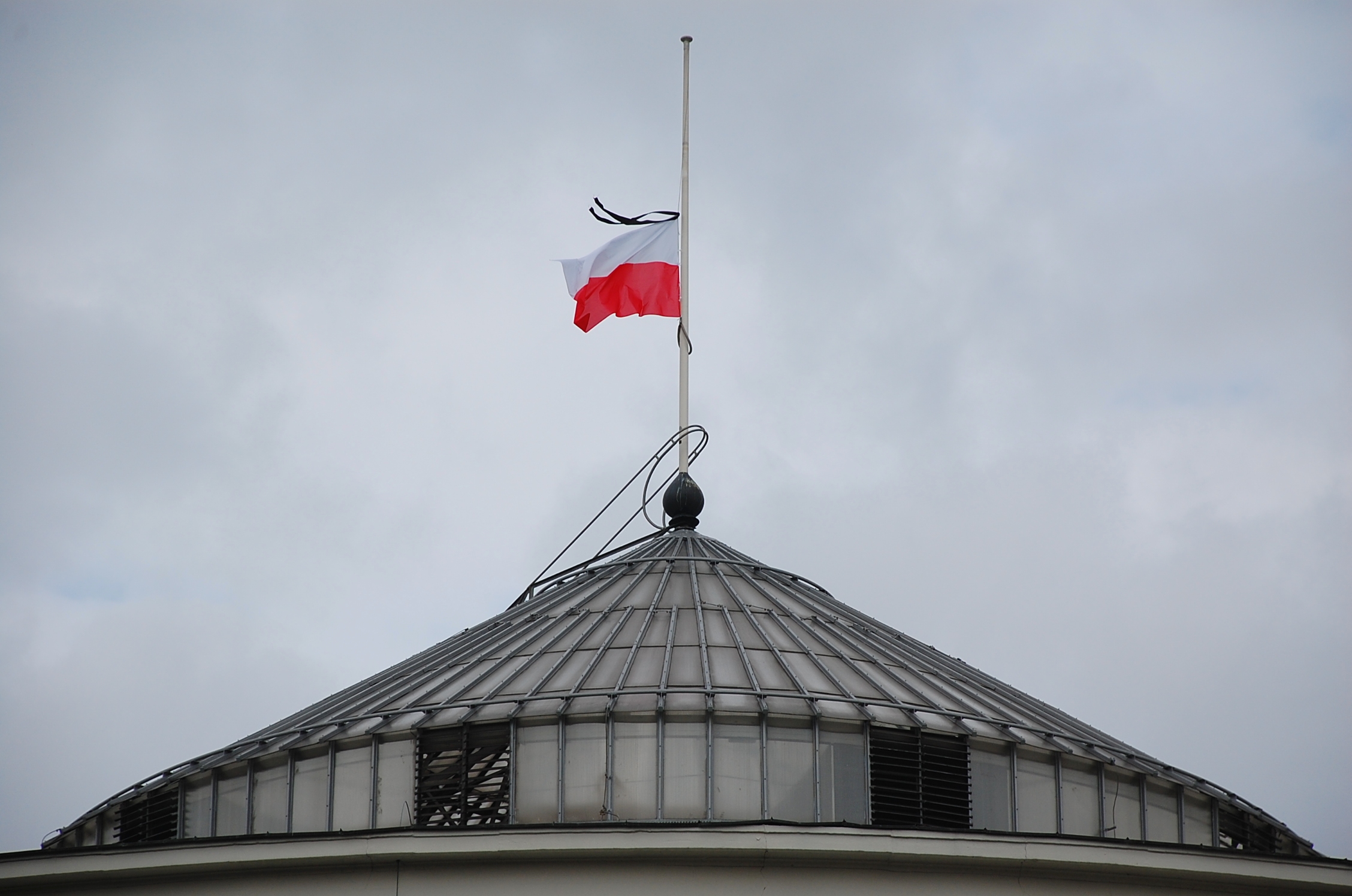 English: Flag waved at half-mast at Sejm building, Warsaw, Poland
