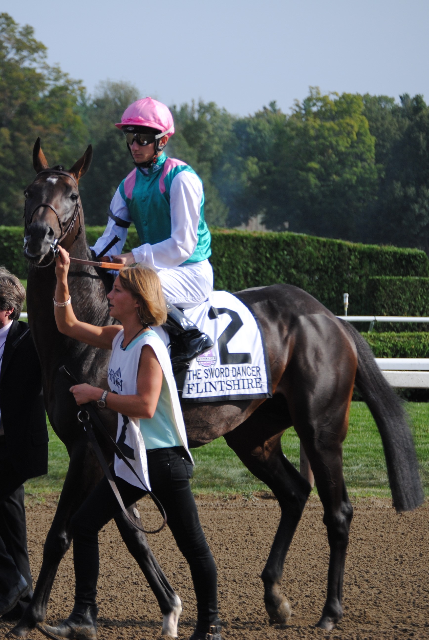 English: Flintshire, ridden by Vincent Cheminaud, in the post parade for the 2015 Sword Dancer |