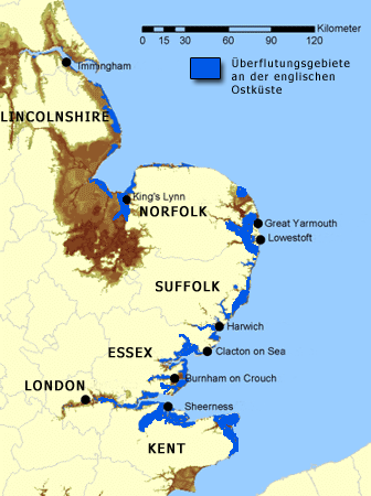 English: Map illustrating the extent of the Great Flood of 1953 in the United Kingdom