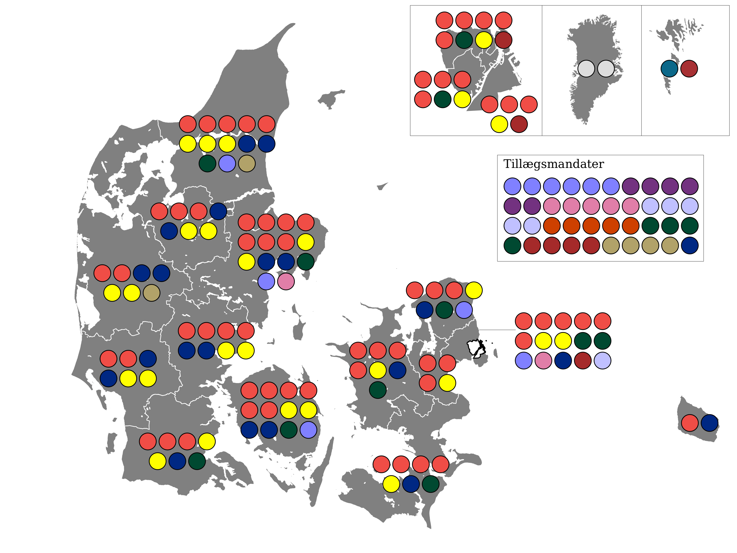 English: Election map of the 1977 Danish general election.