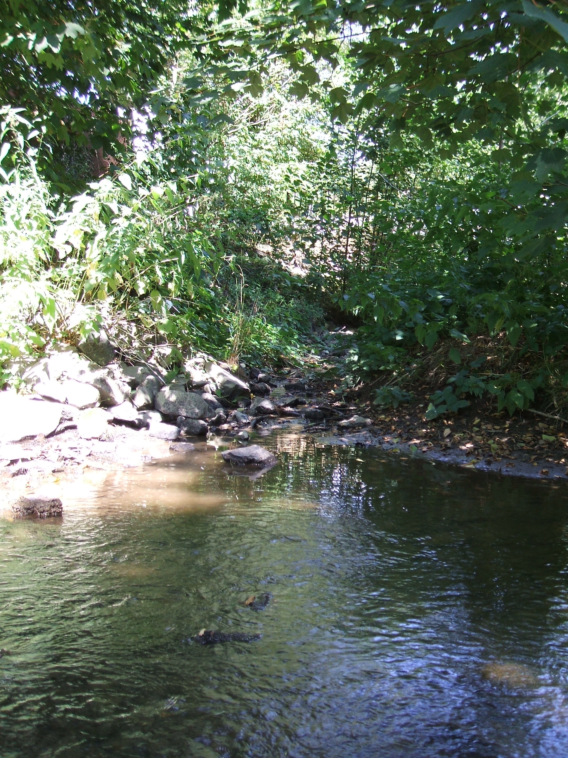 Deutsch: Linkssseitige Einmündung des Forbachs (von hinten, unter einer Brücke unter der B 275 hindurch kommend) in die Usa (von links, Westen, kommend, nach rechts, Osten, abfließend) am westlichen Ortsrand von Langenhain-Ziegenberg |