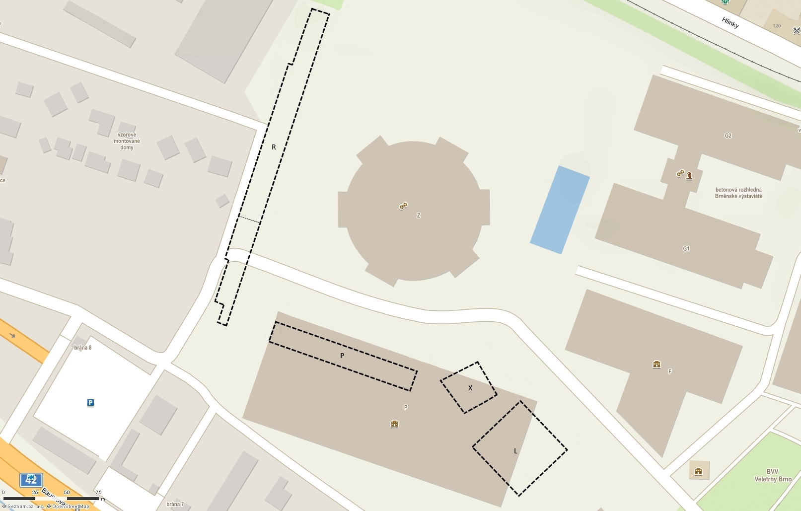 English: Map of the western part of the Brno Exhibition Grounds with contours of the demolished pavilions R, P, X and L. The southern part of pavilion R (below the narrow dashed line) was demolished in 1990s, the rest collapsed in 2010. Pavilions P, L and X were demolished in 2008 to make space for the new Pavillion P.